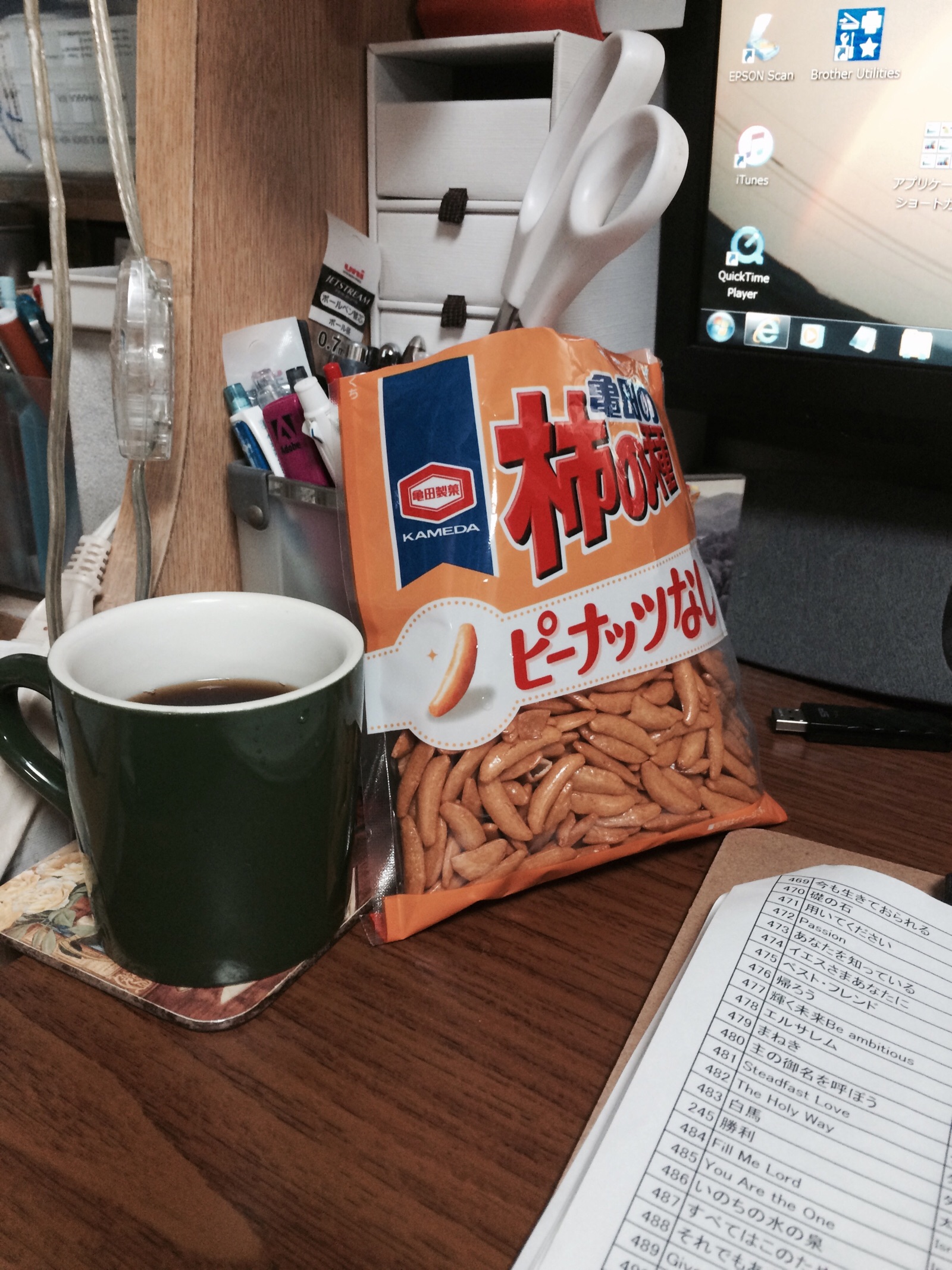 今日のこちらの武器はコーヒーとピリッとする柿の種。ピーナッツも欲しいところ。 テモテ