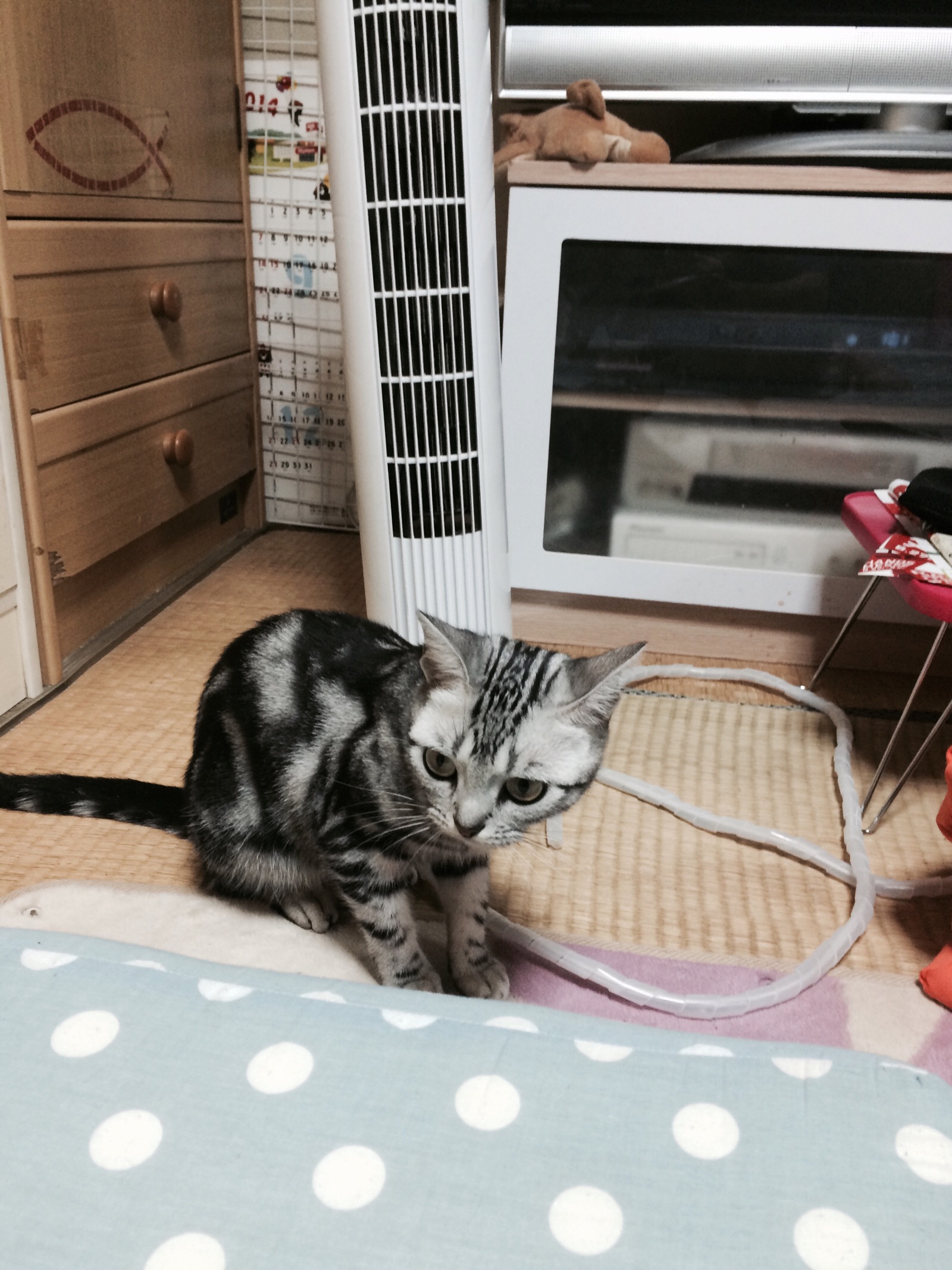 ネコの後ろにあるタワー型扇風機は、スカイツリーが出来た年に、その記念セールということでBカメラで600円で買ったものです。 テモテ