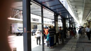 バス停近くを通ると、暑いのでミストシャワーが