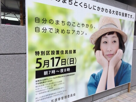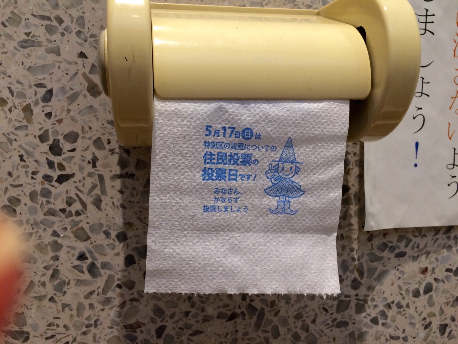 先ほどの会館は大阪市の建物だったからでしょうか。 トイレットペーパーにまで、住民投票の告知がされてました。 大阪 hannah