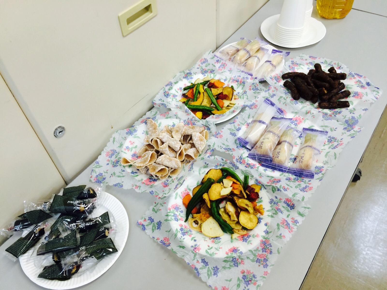 会場の後ろには美味しそうなお菓子が置いてあります。かりんとうがある!神戸john