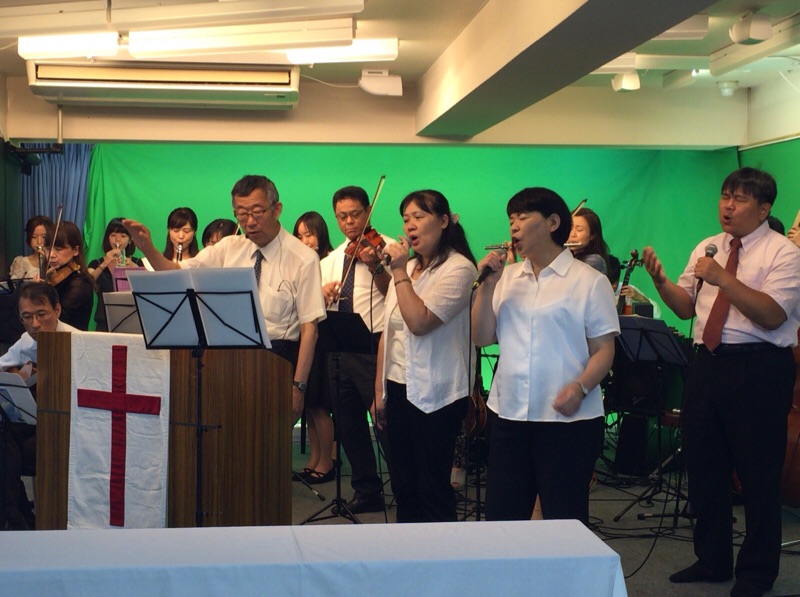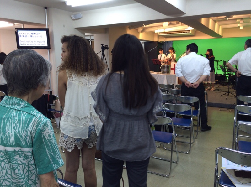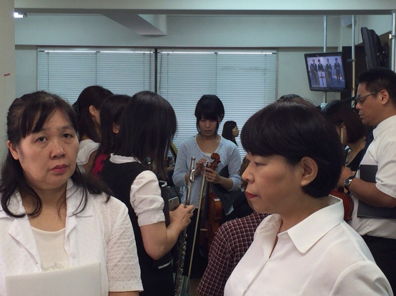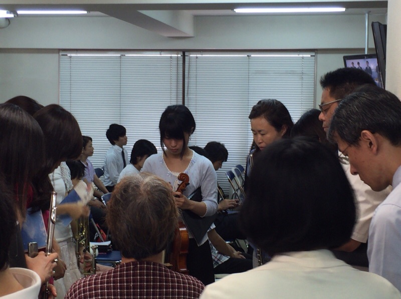 次の牧師賛美に備えるコーラスとオーケストラのメンバーたち。ビオラを抱えた友香ちゃんの姿も見えました。 東京アンテオケ