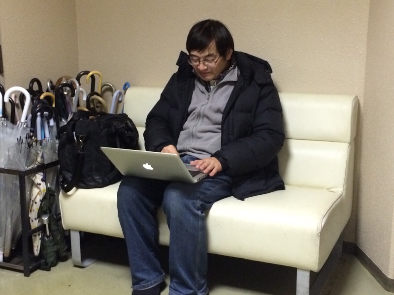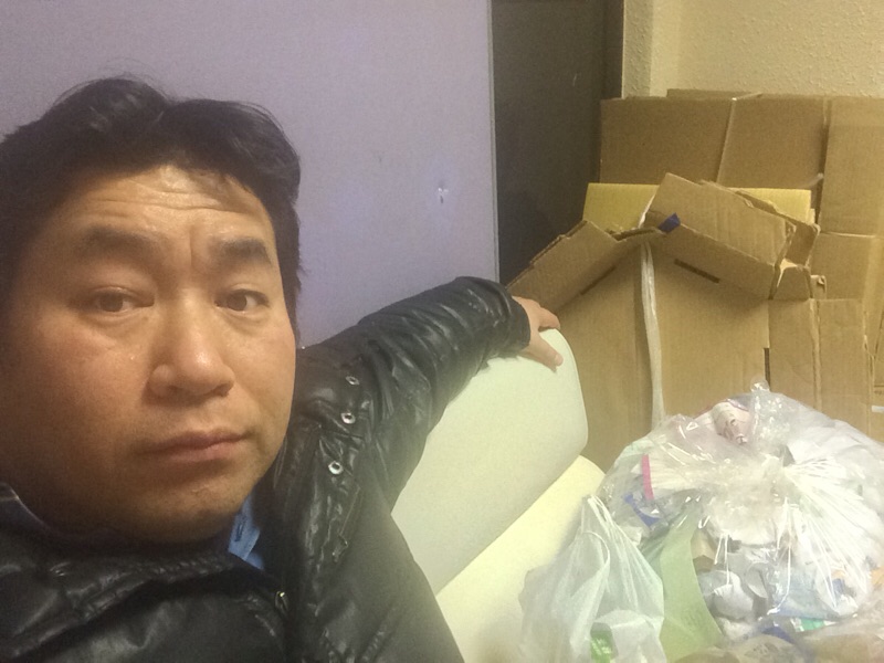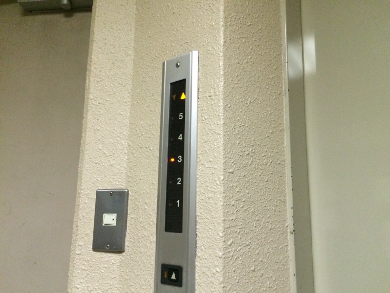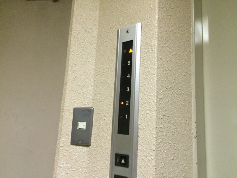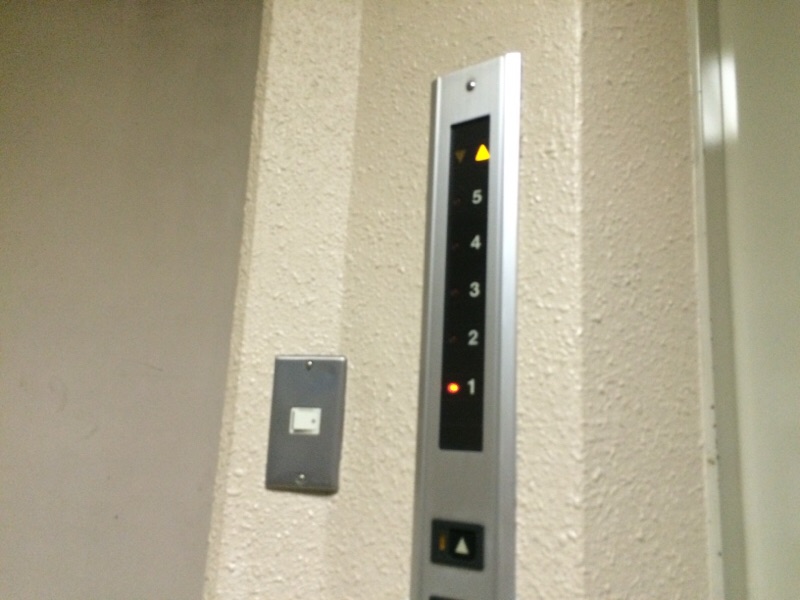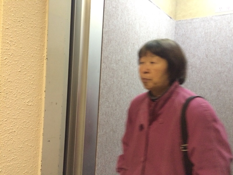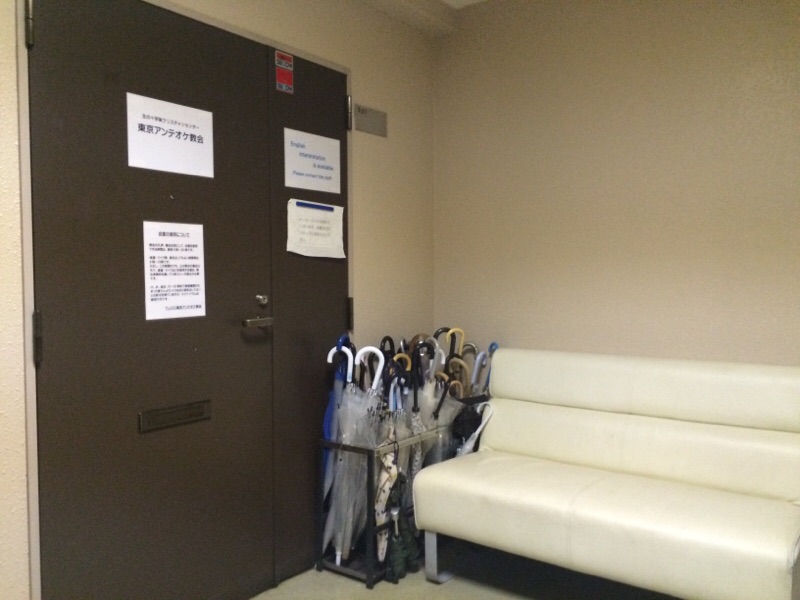 エレベーター前、到着! ソファにゴミ袋。 なんだかんだで、後、少しで次の祈祷会です。