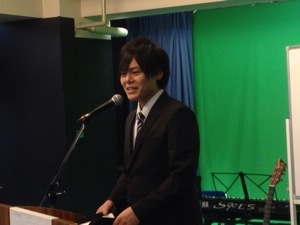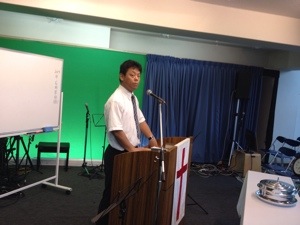 礼拝スタート! 今日の司会の益川さん、ちょっと緊張気味。