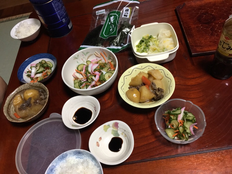 肉じゃが、酢の物、お漬物、焼き海苔。