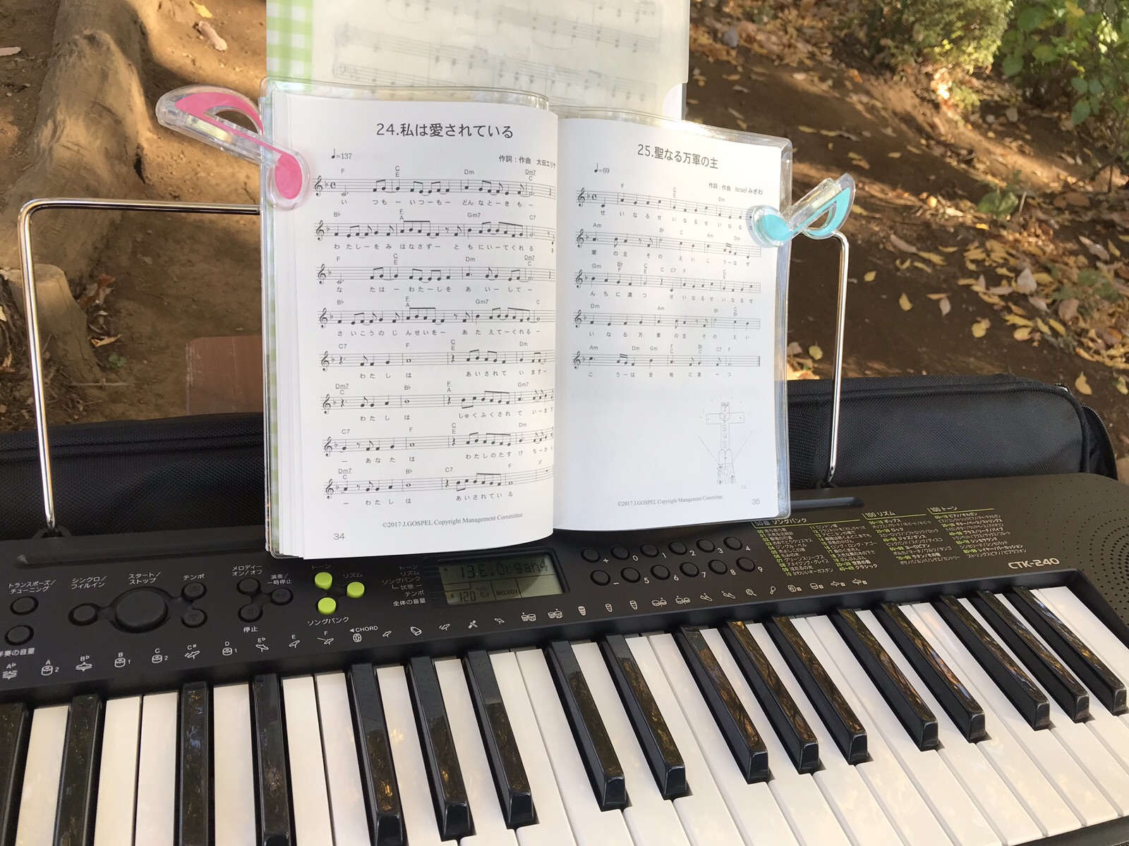 公園賛美しています。途中、電池切れでピアノの音が消えてしまった途端にそこら辺で聴いていた(と思われる)人々が一斉に離れて行ってしまい…ショック。