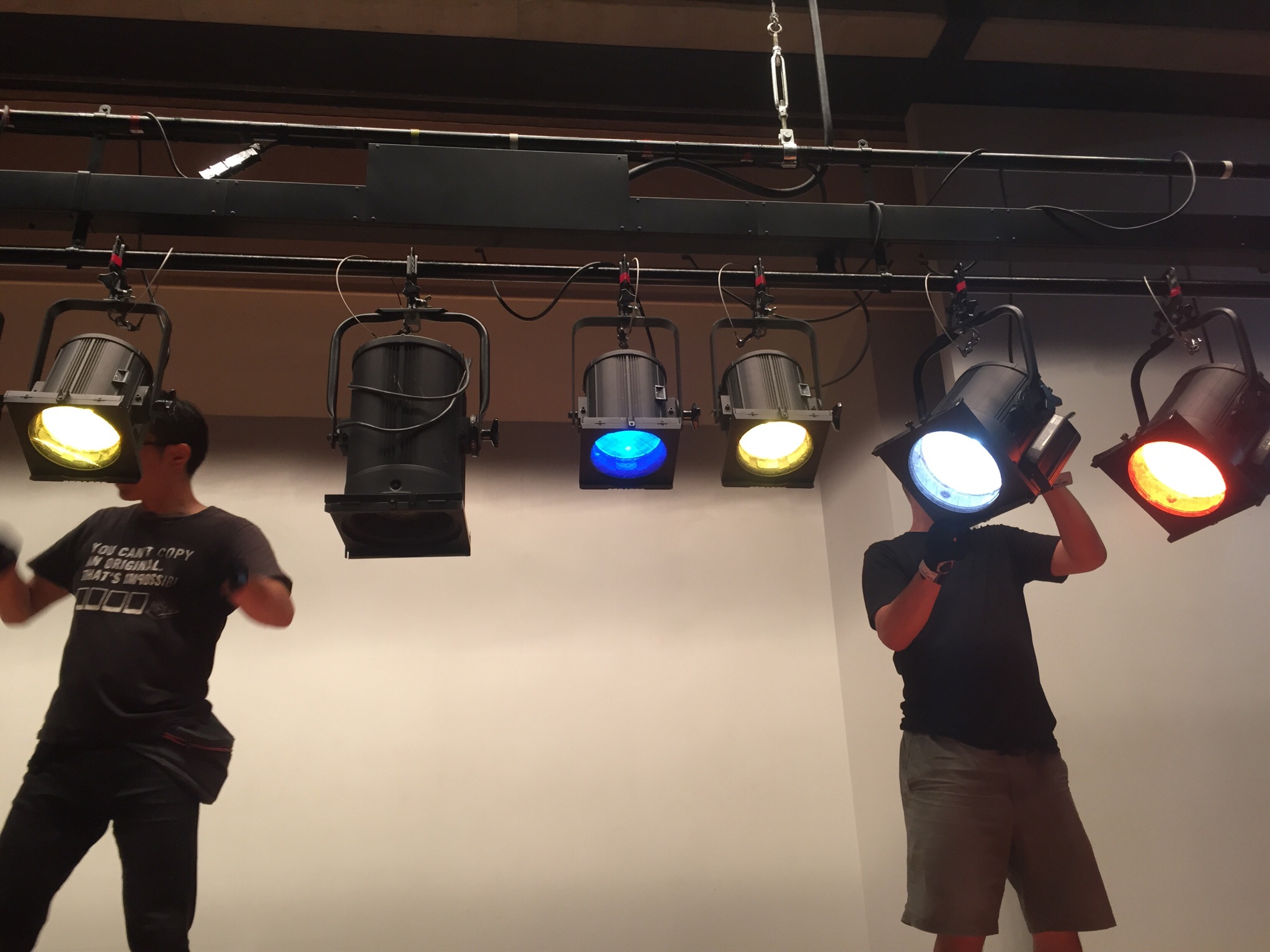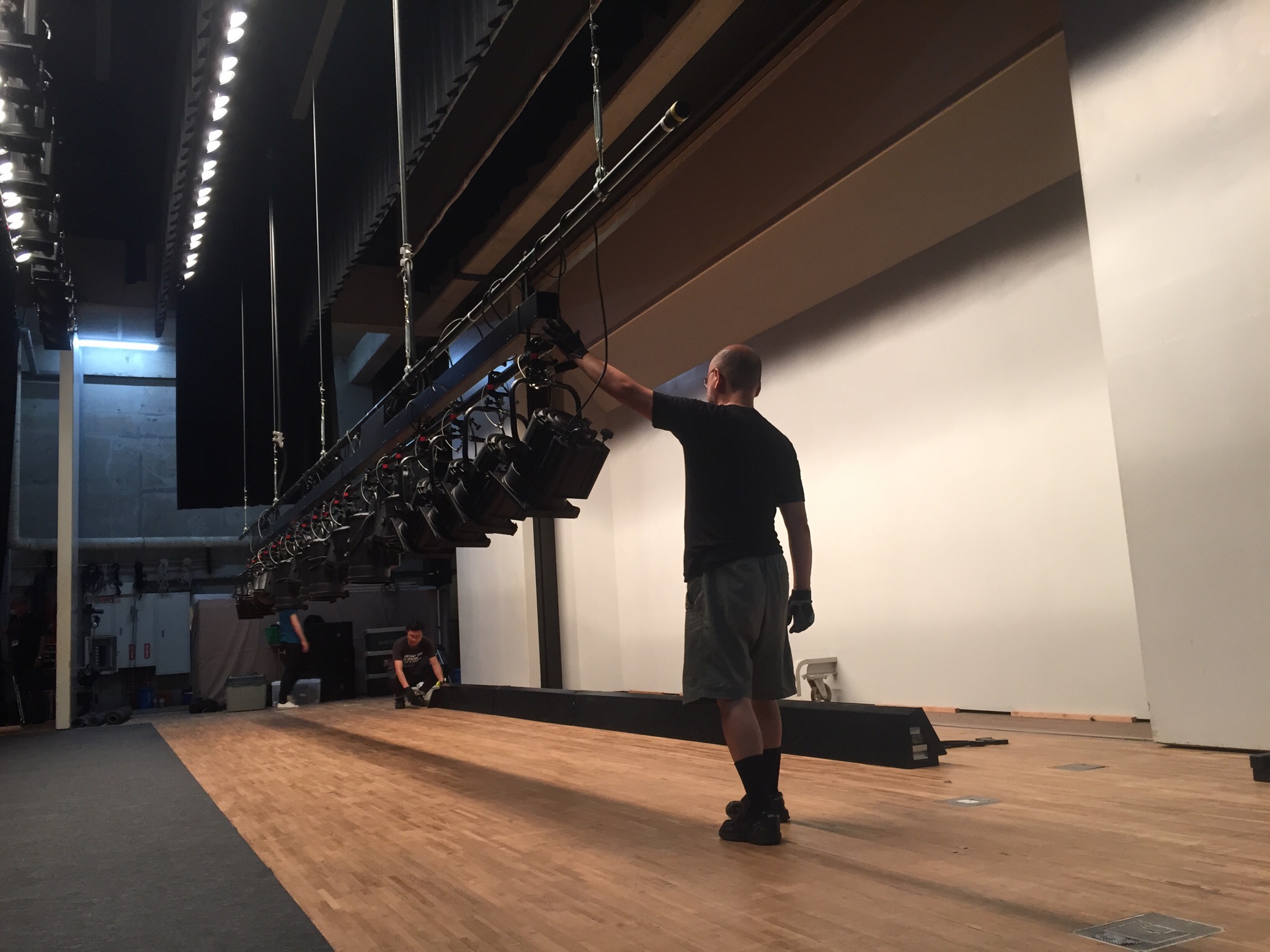 間瀬さんと光さんで照明仕込みをしています。