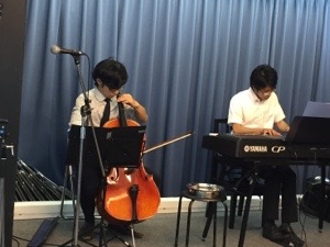 真境名さん、賛美を導きます。 ダビデさんがチェロ、ピアノは仲本さんのゴールデンコンビです。