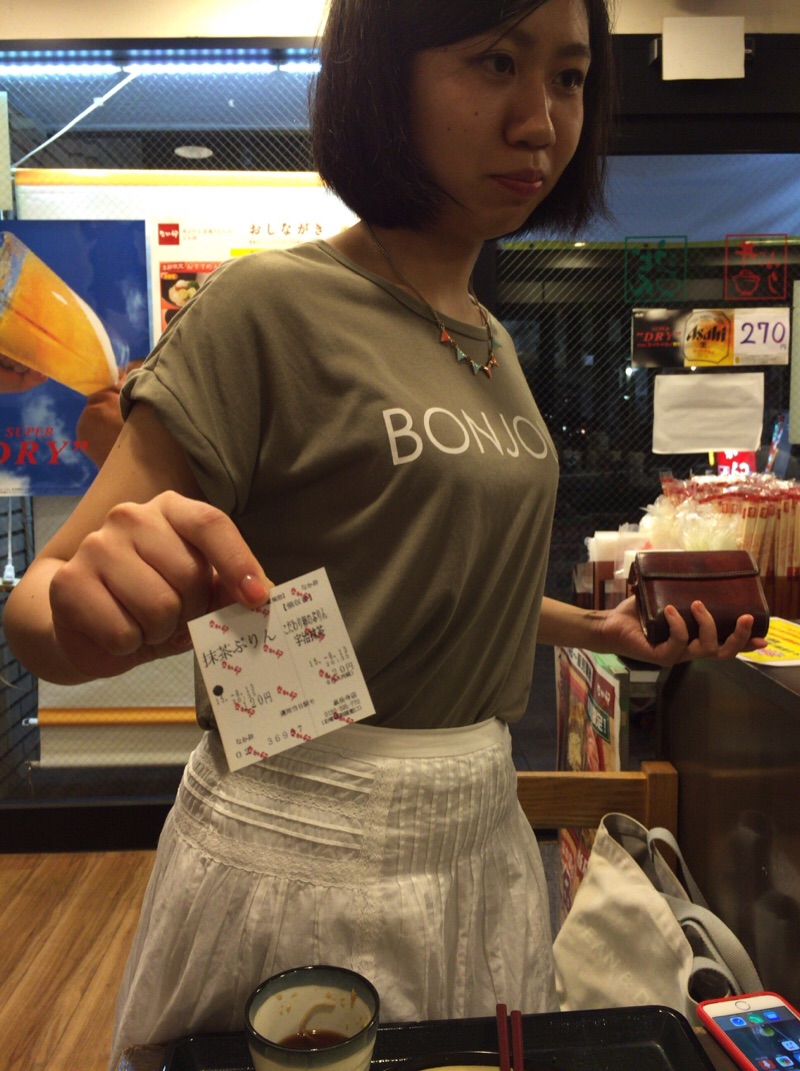 抹茶色のTシャツを着た唯が、抹茶プリンを頼んでいます。 オギハラ