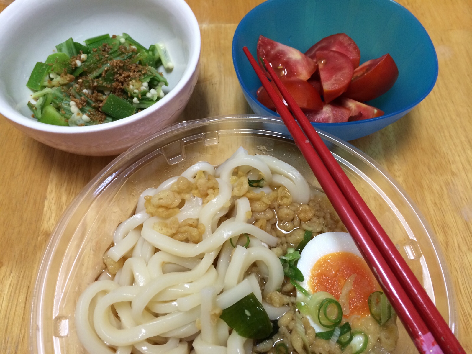 お昼〜! 遅くなりましたが… チャチャっと作って、コンビニで買って来たぶっかけうどんと。 Gifts Kayano