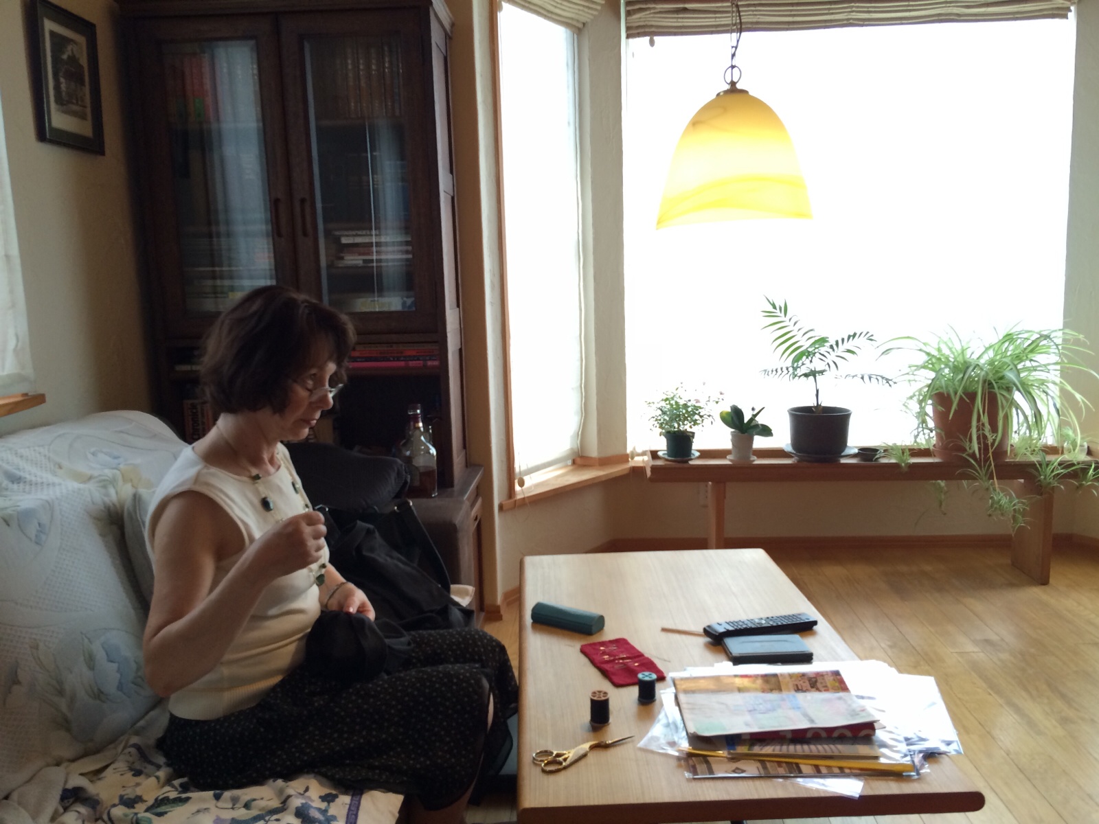 ヨハンナさんが、ほつれてる私のズボンの裾を縫ってくれてます。 ミカエル
