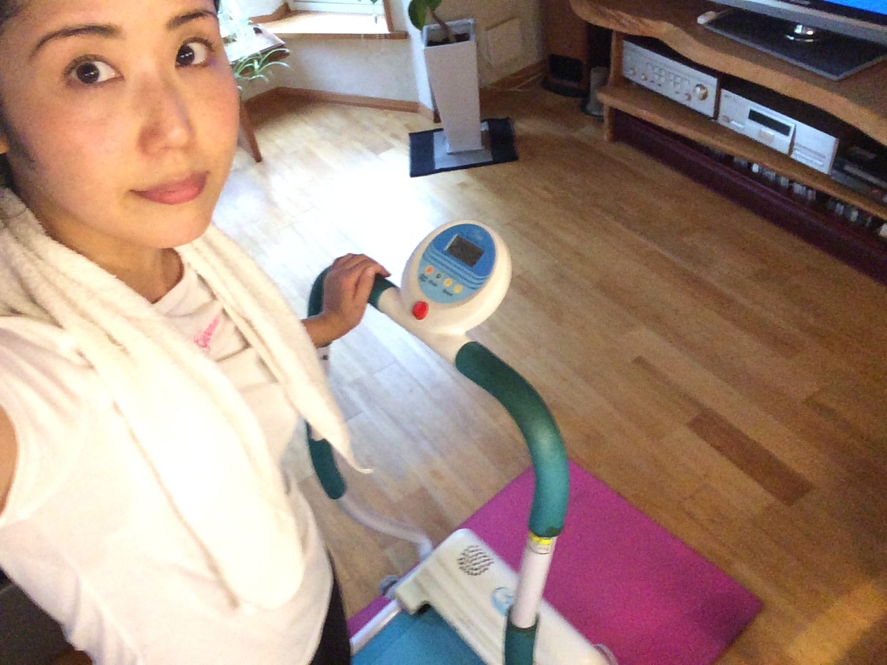 両親が使ってるマシーンで、30分の運動、今、終わりました。 汗、びっしょり。 ミカエル