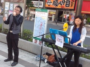 6時半からのいやしの集いのために、路上ライブをしながらチラシを配っています。まどか