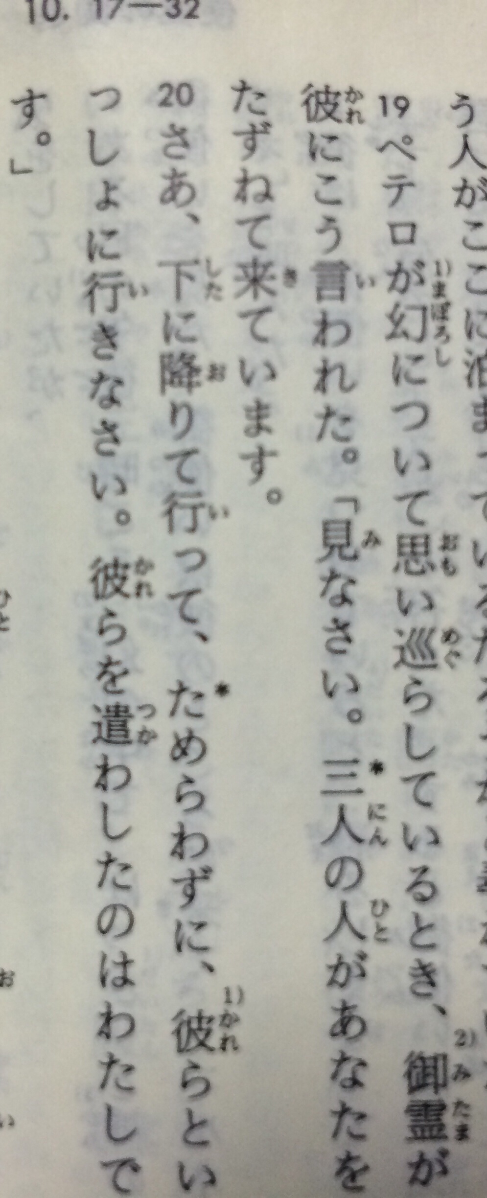 「見なさい。三人の人があなたをたずねて来ています。」「ためらわずに、彼らといっしょに行きなさい。彼らを遣わしたのはわたしです。」