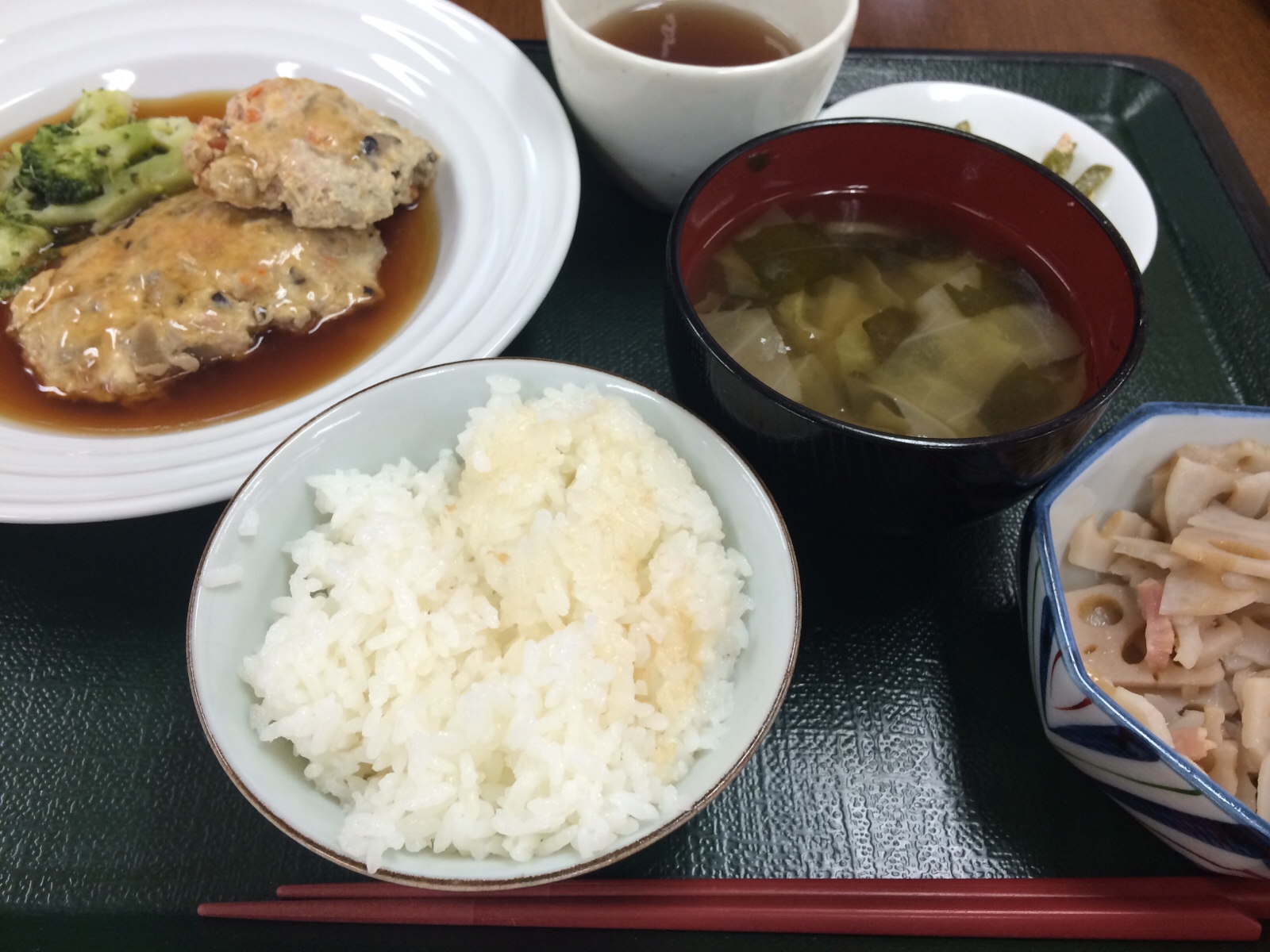 豆腐のハンバーグと、レンコンとベーコンの炒めものと、ピーマンのたらこ炒め、ご飯、味噌汁。 ミカエル