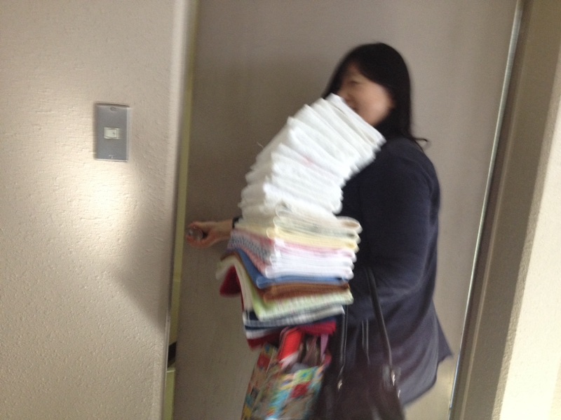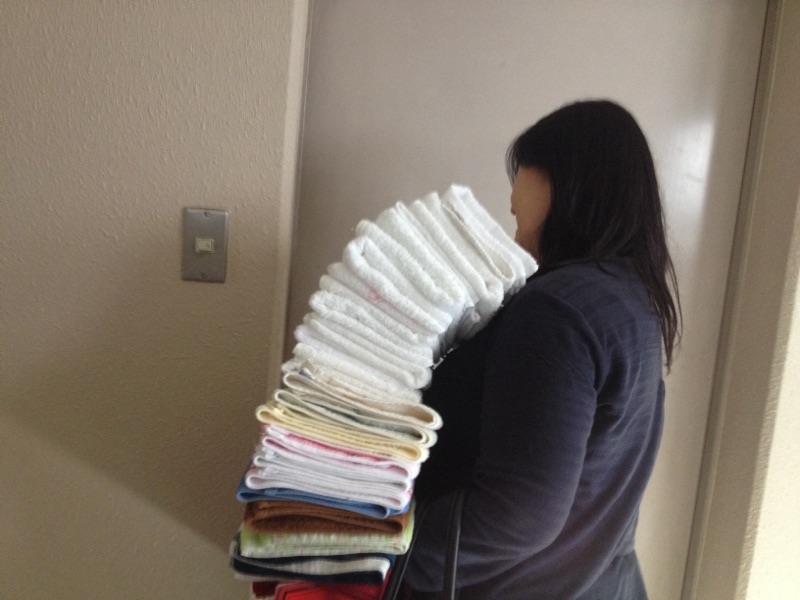 教会事務所でお洗濯したタオルを運ぶ則子さん。 kato