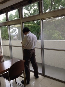 電波の入りが悪くて窓側に行かれたイザヤ牧師。パトモス前で連絡等、お忙しいです。