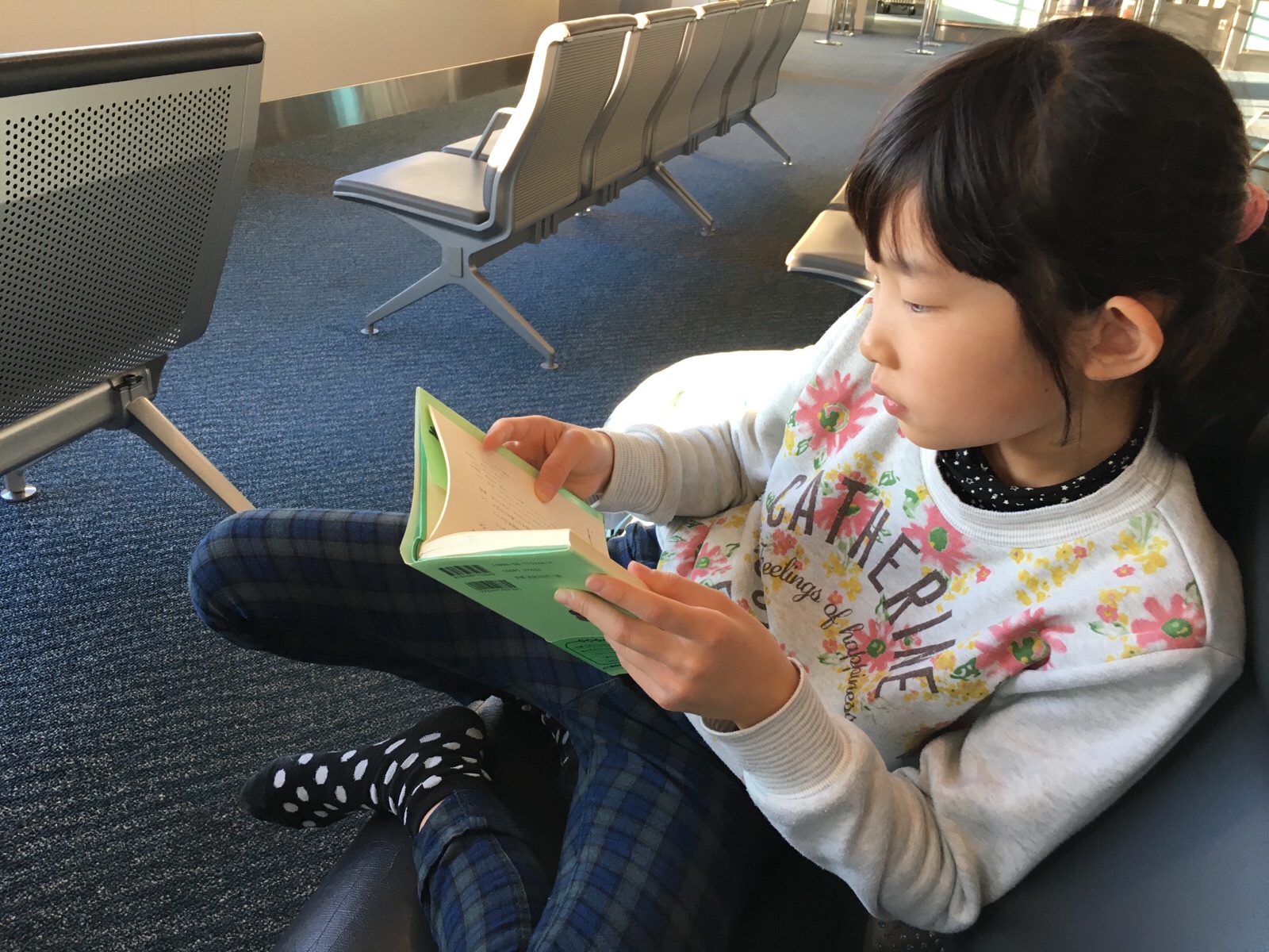 羽田に着きました。 飛行機の時間まで読書する娘。 ふじい