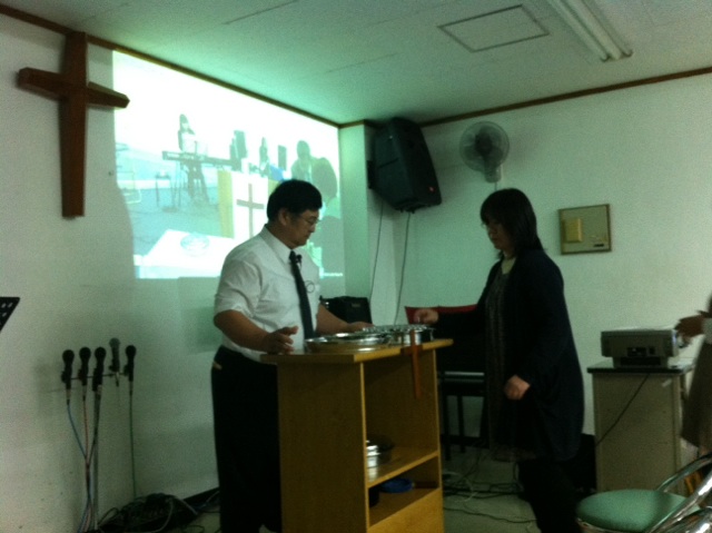 受付とPA係りです。今日のPAは牧師の次男の保育園の時の担任の先生です。
