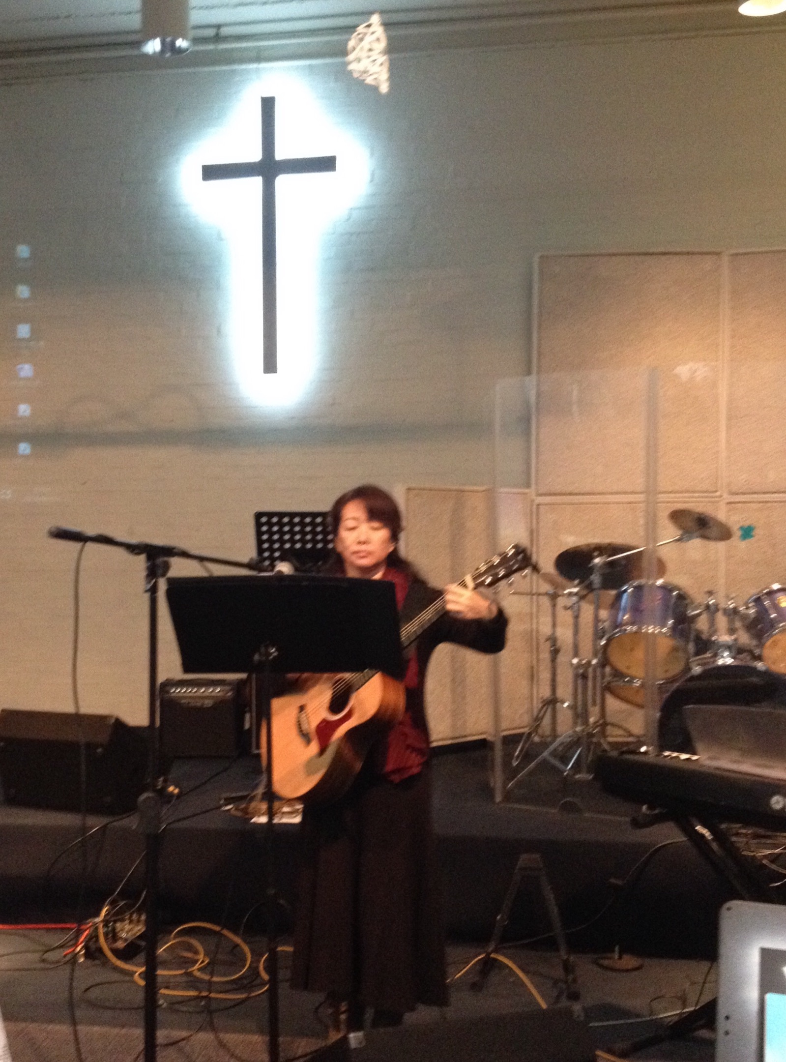 真理子さんの奏楽です。 ギター1本で頑張っています! *\(^o^)/* ロサンゼルス フェイス佐々木