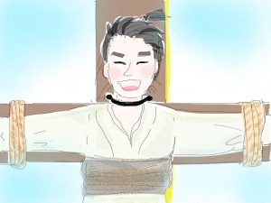 指で描いていたこともあり、「直線」を選んで線を引くのですが、指の太さで画面が見えず苦労しました。また、本来は、この絵のような磔ではなく、杭にまたがるようにしてくくりつけていたようです。パウロ三木は、とても小柄で、杭に腰をかけると首を吊るようになってしまうため、帯で上に持ち上げくくりつけたということです。