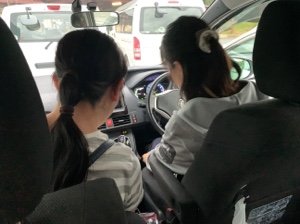 陸田さん、素子さんから車のレクチャーを受けてます。