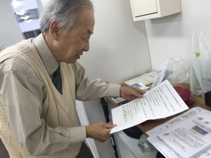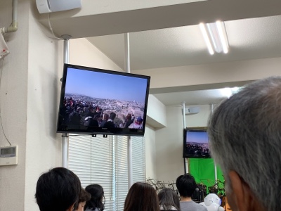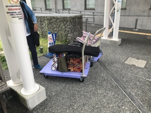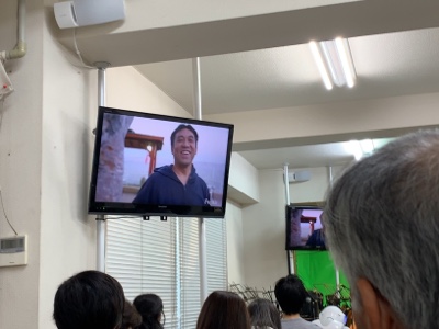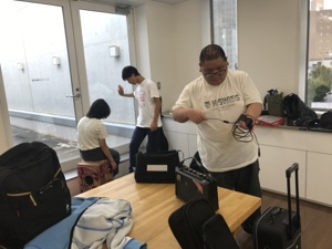 礼拝会場仁到着して準備しています。