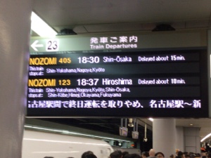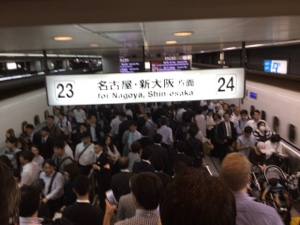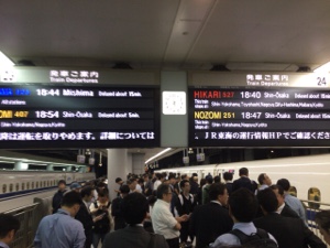 飛行機の欠航が出るためか、早めに帰る人が新幹線利用で大混雑。マス