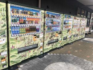 自動販売機に長篠合戦の屏風図。長篠の戦いは、織田信長と武田信玄の戦いです、と歴史の勉強。jeshu