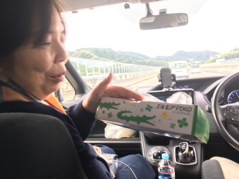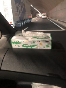 ワニの柄がかわいいティッシュペーパー、この谷口さんの車で行った第3チームからの頂きものです。