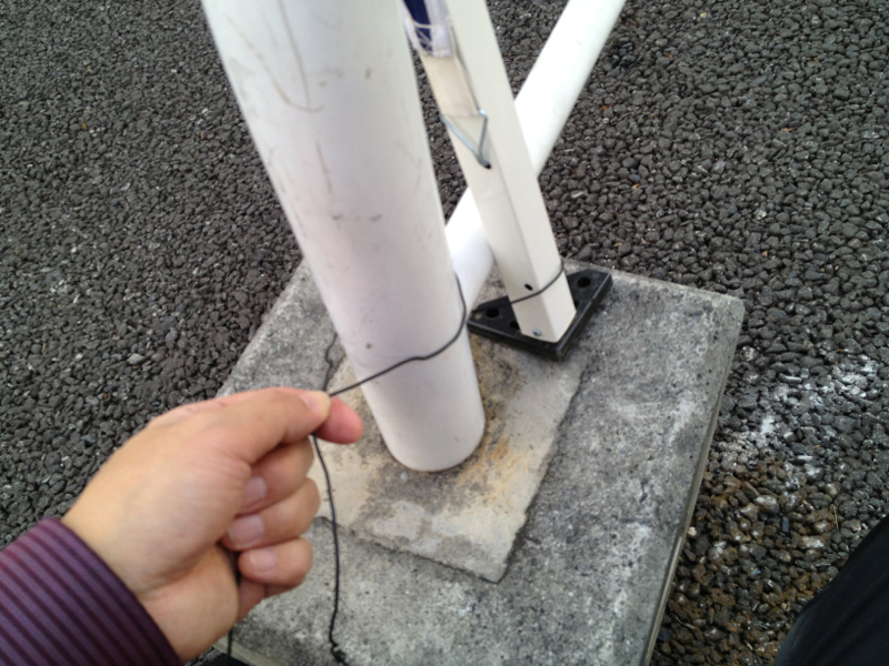飛ばされないようにブロックに結わえます。