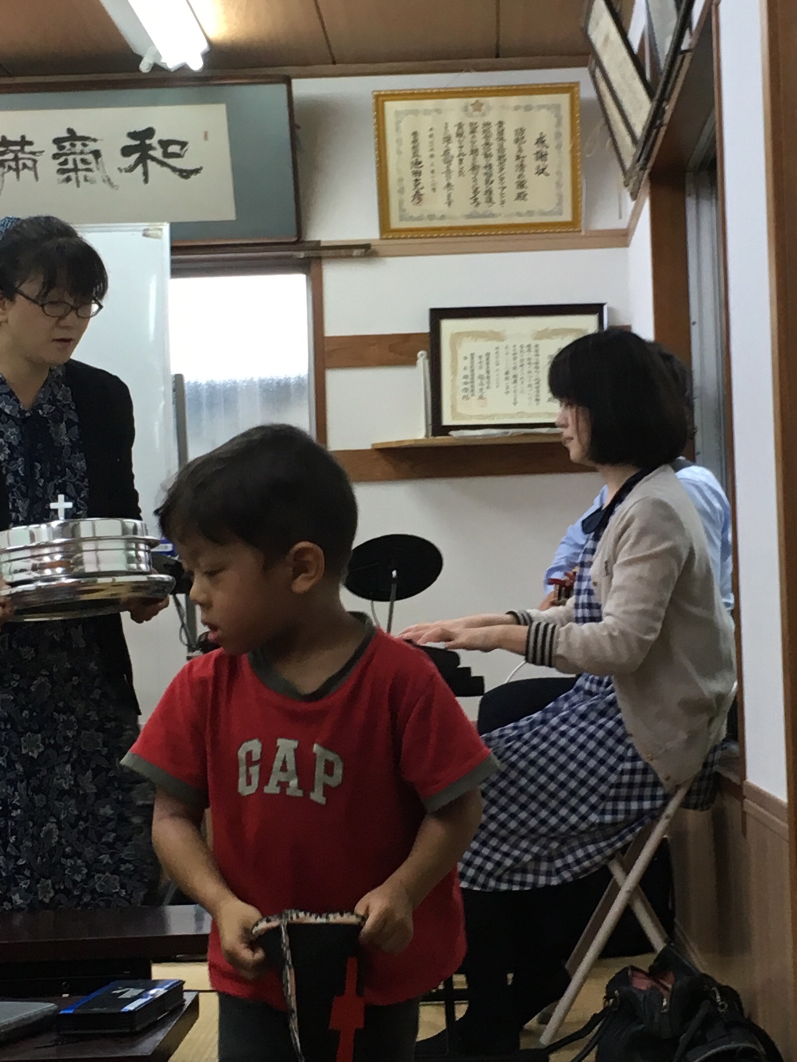 聖餐式の配膳は、ウラノスのジョイさん。奏楽は♪飛行機に乗って♪のラベイユゆみちゃん。 テモテ