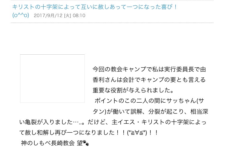 ポイントのこの二人の間にサッちゃん(サタン)が働いて誤解、分裂が起こり、相当深い亀裂が入りました…..。だけど、主イエス・キリストの十字架によって赦し和解し再び一つになりました!!(*≧∀≦*)!!