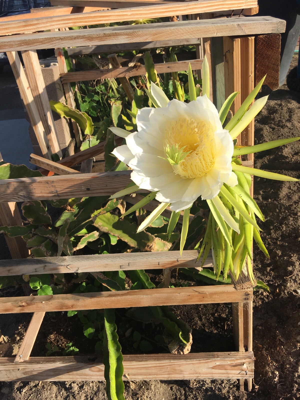 ご近所のあちこちで見るドラゴンフルーツ栽培。花のあとに実が成り、ピンク色に色付きます。 花が豪華で綺麗です♪