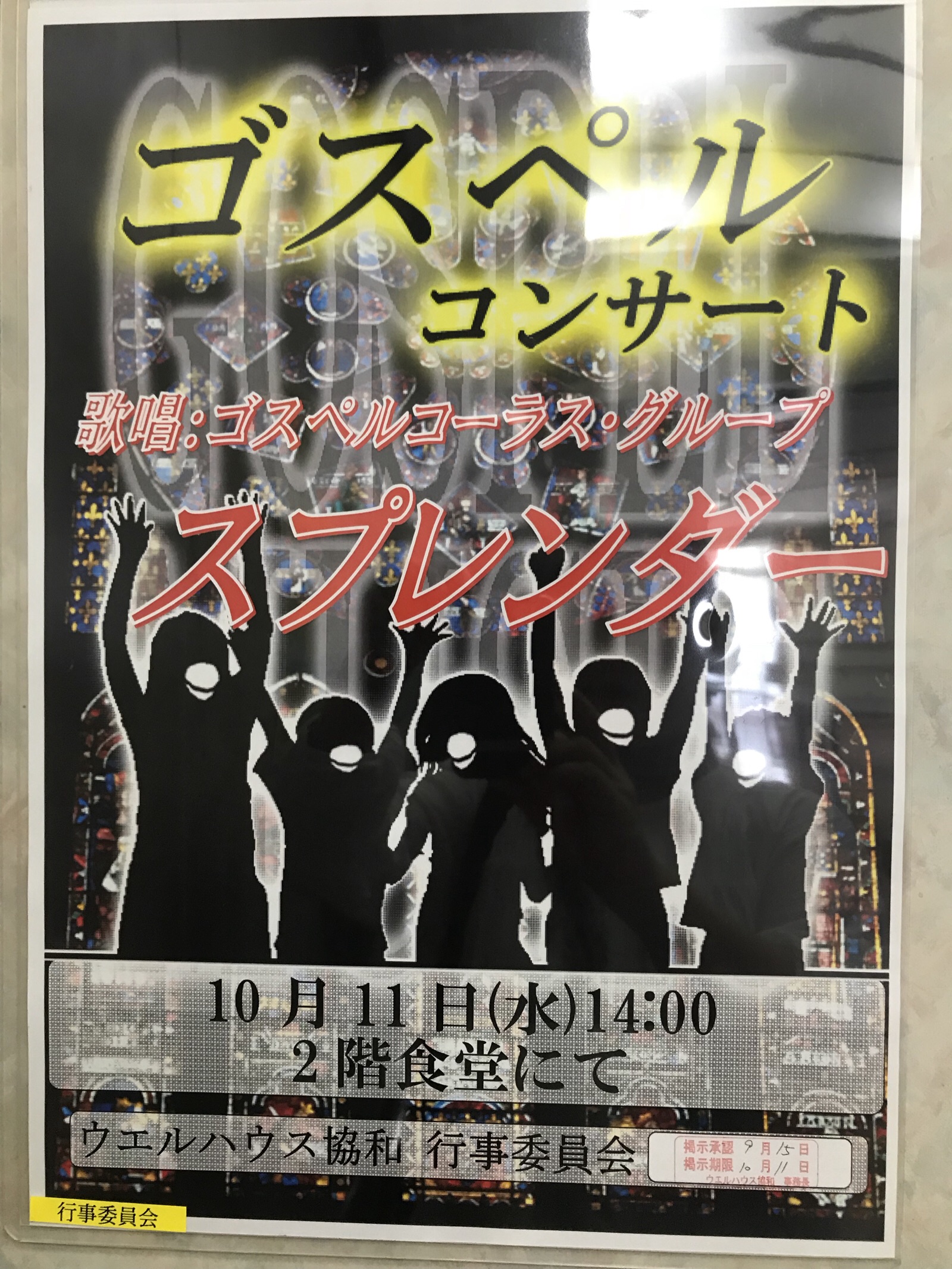 吹田市の介護施設でスプレンダーのコンサートがあります! これは、ポスターです! 大阪エステル