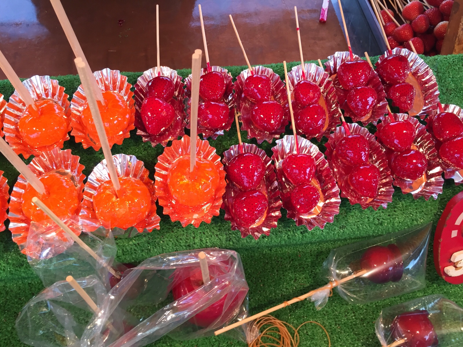 先日の花火大会の屋台で、ぶどう飴、みかん飴、イチゴ飴を初めて見ました!