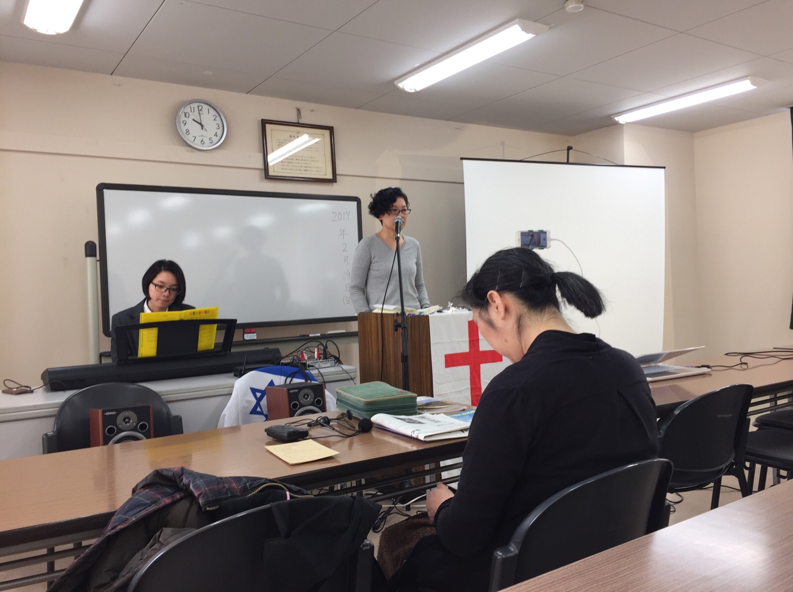 礼拝前のお祈りです。ルツさんの服が春らしいです!