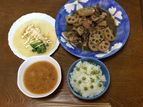 主人のリクエストで、冷凍のグリンピースで「お豆のご飯」