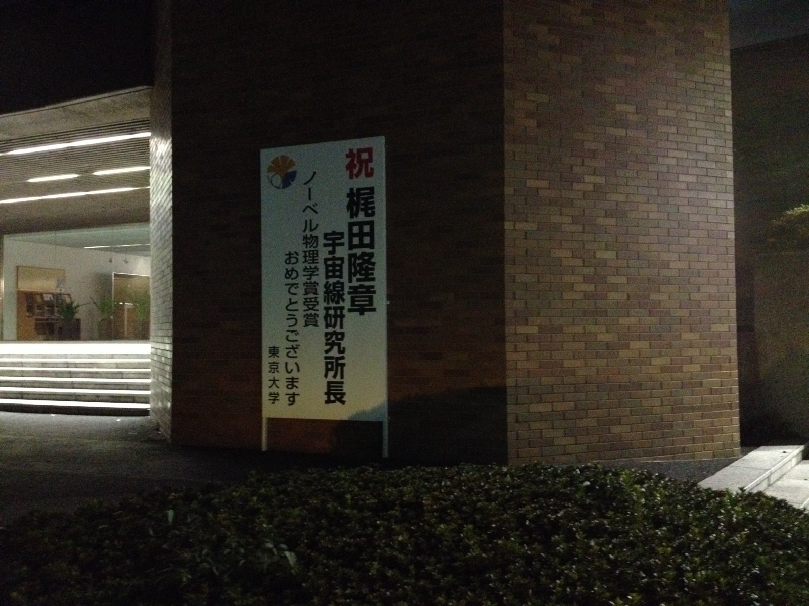 外に出た門のところにも梶田さんをお祝いする看板。 今度明るい時に来てみたいです。 kato