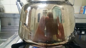 祈祷会を終えて、湯を沸かす。 ヤカンに私を映してみました。