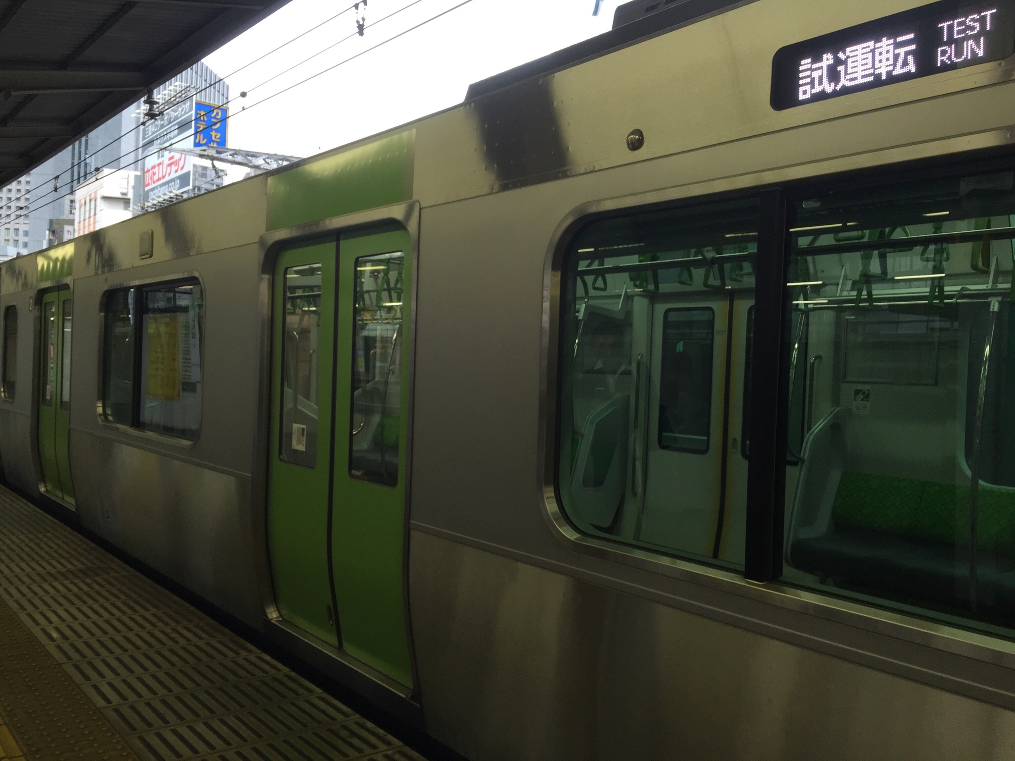 試運転中の山手線に遭遇しました。ドアは開きませんが、ホームに少しだけ止まって発車しました。なんだか不思議な感じ。新しい車両なのかな? Yui