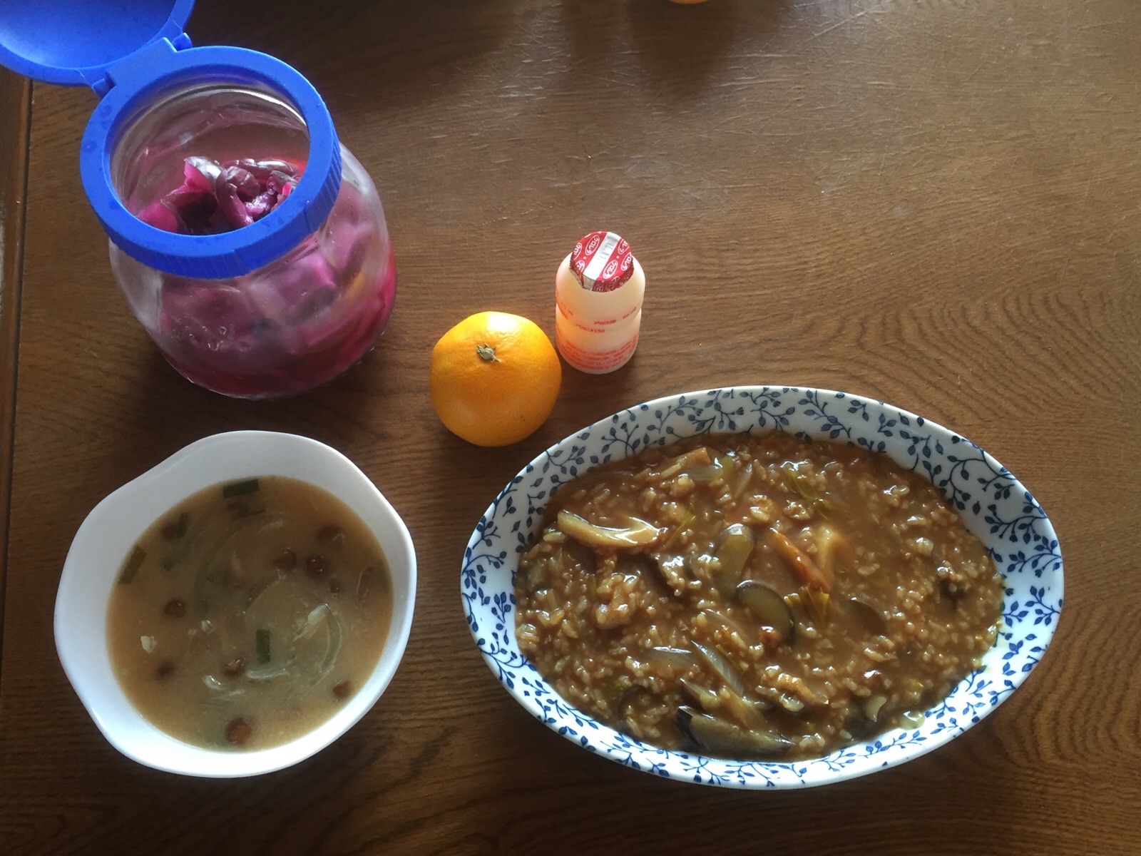 カレーリゾットに、頂いたナメコのお味噌汁、トマト……美味しかったで〜す。