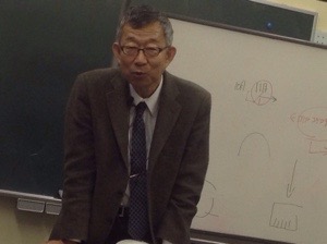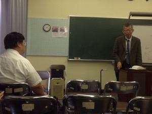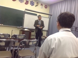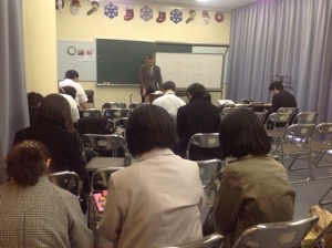 名護の国際交流会館で聖会中。 秋元さんが賛美を導いています。