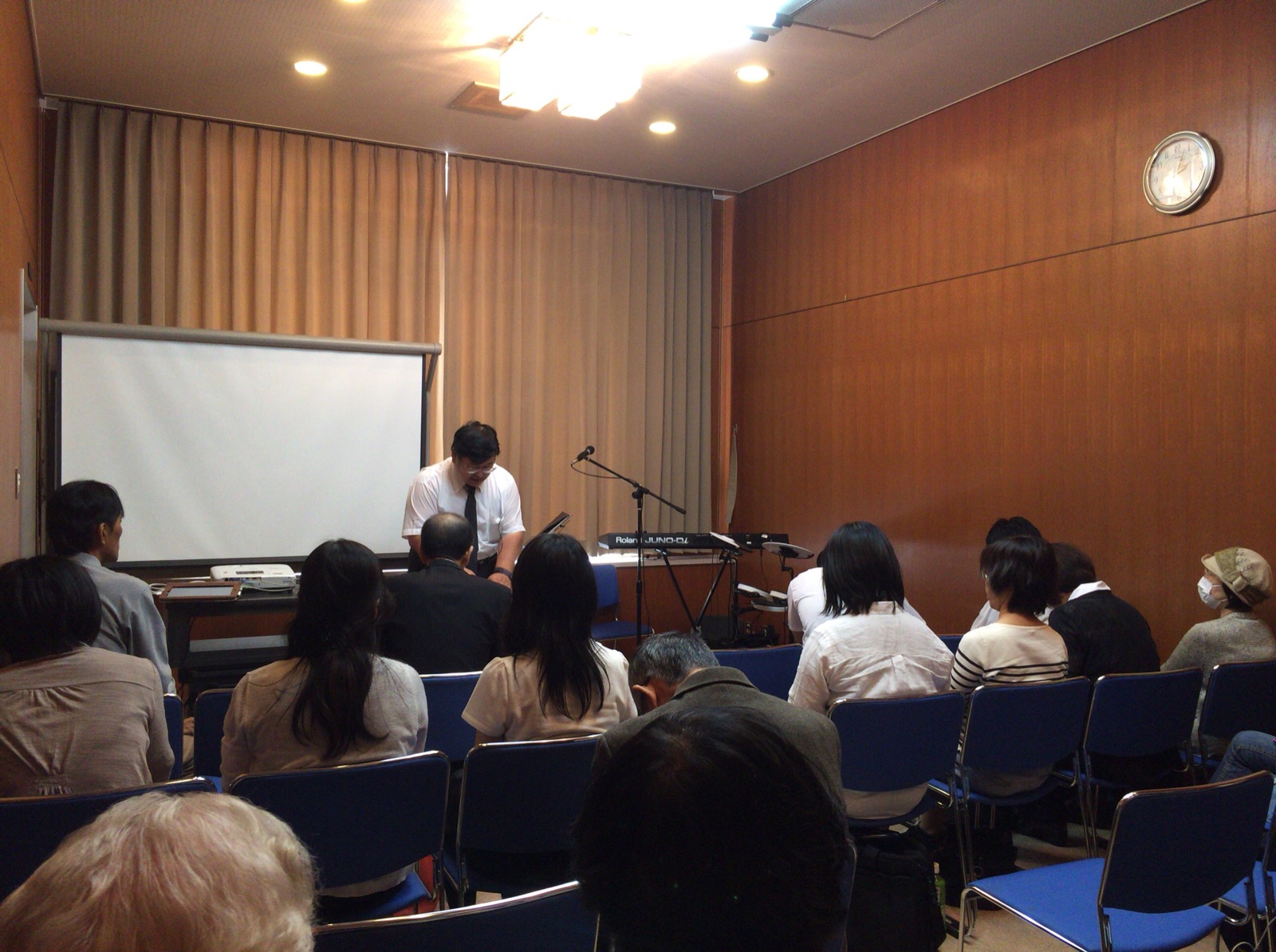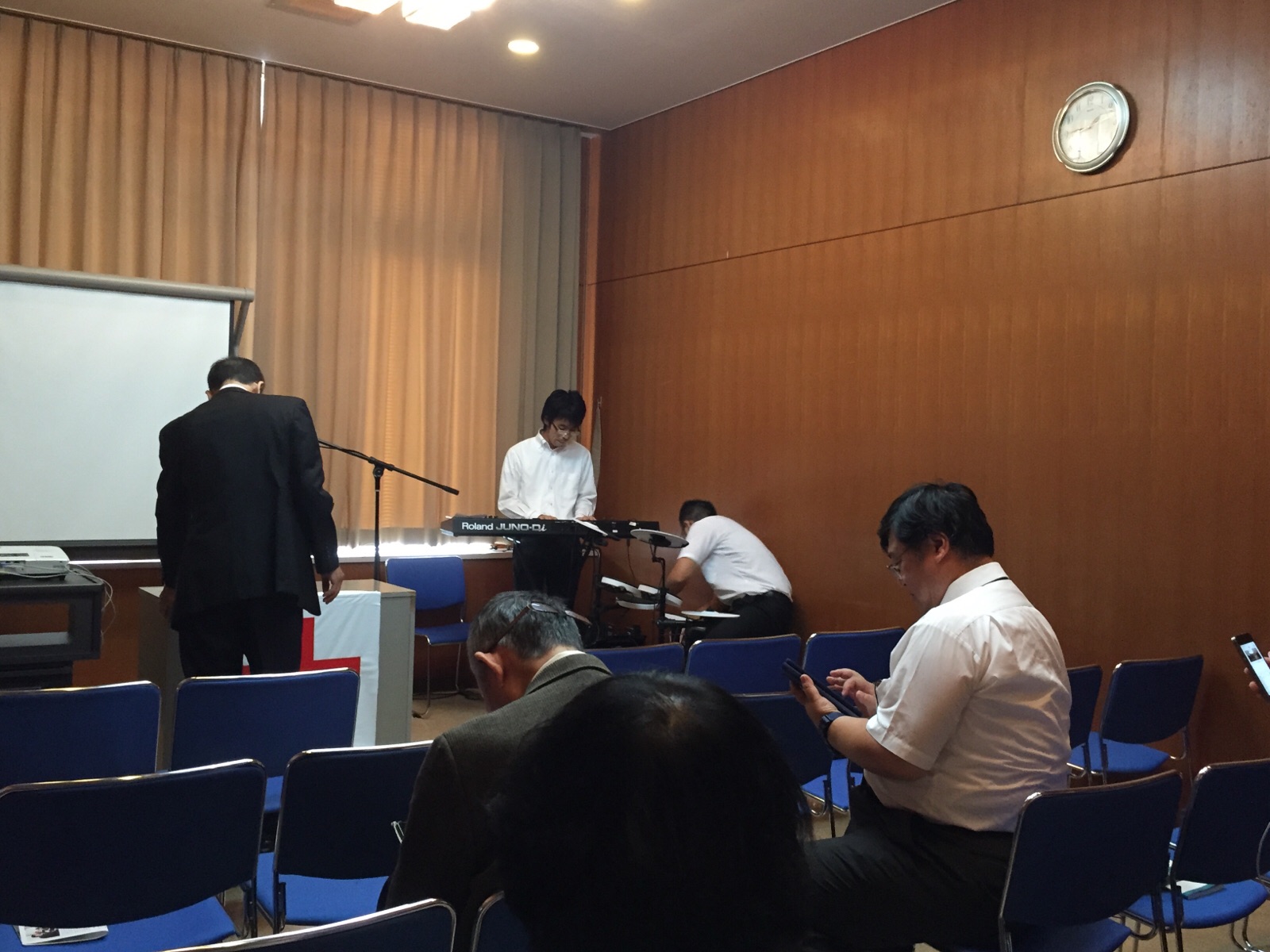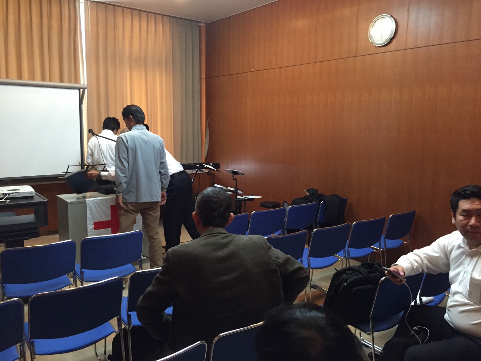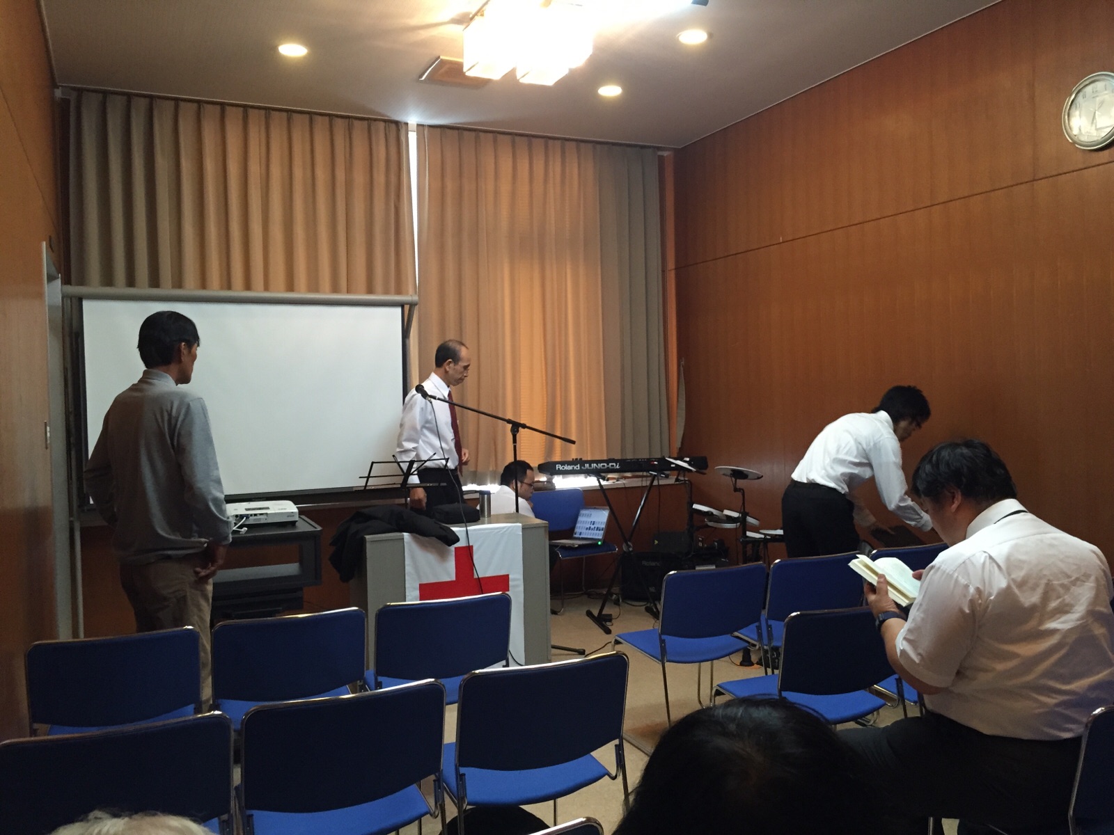 涼君はプロジェクターの準備に続いて、ドラム、ギターの音出し。 永藤さんが「iPadから歌詞を出す方法を教えて〜」と言っています。 沖縄エルサレム ♪