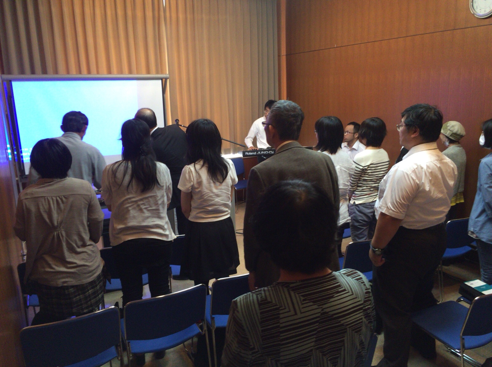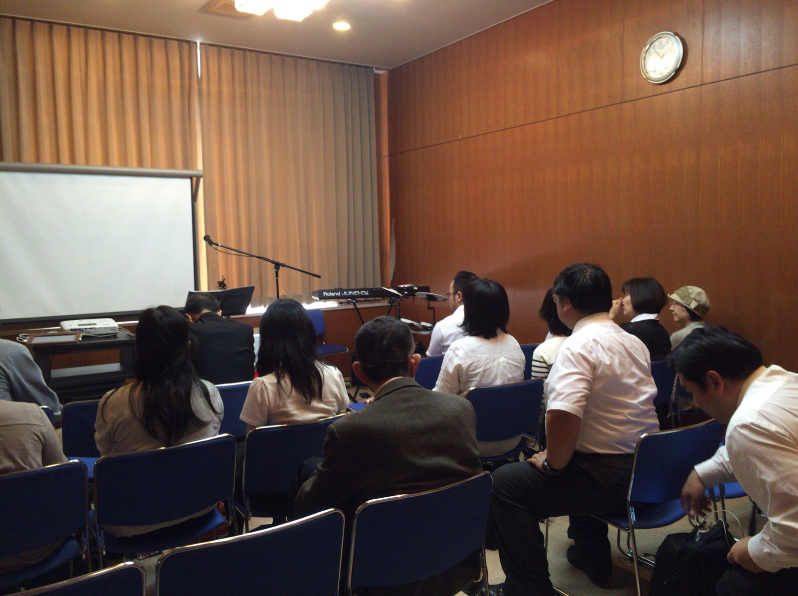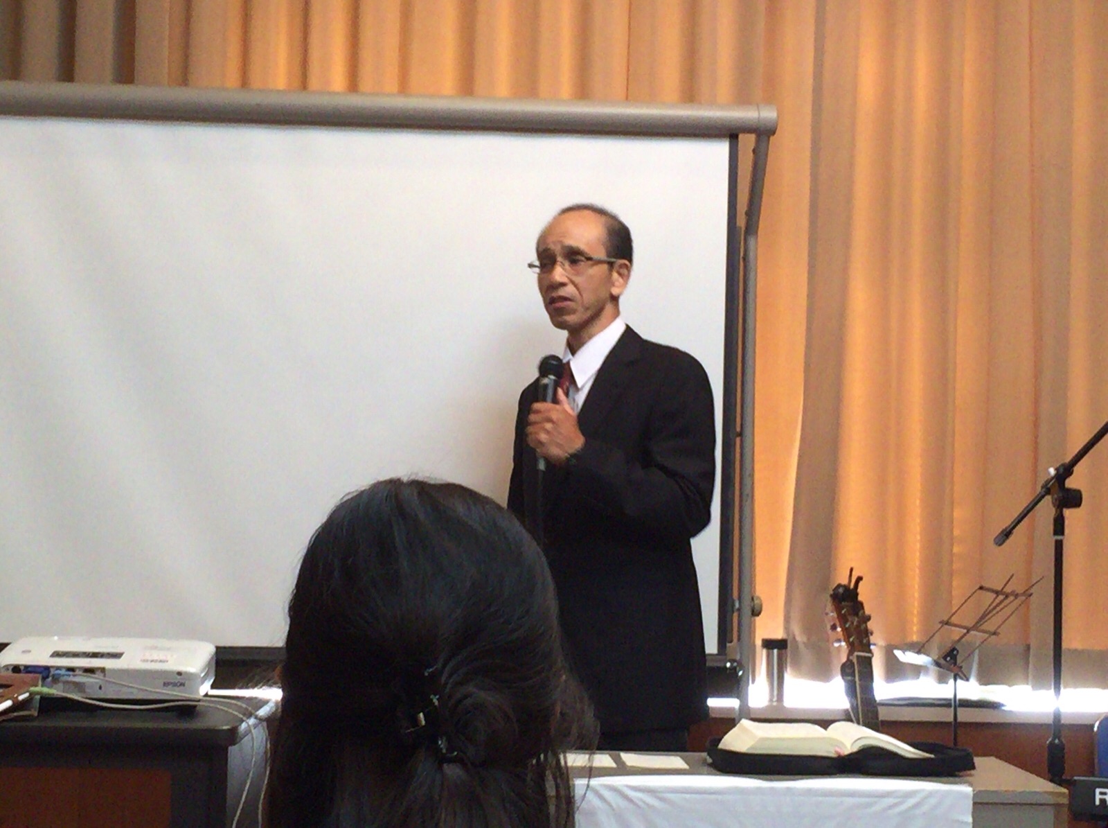 涼君はプロジェクターの準備に続いて、ドラム、ギターの音出し。 永藤さんが「iPadから歌詞を出す方法を教えて〜」と言っています。 沖縄エルサレム ♪