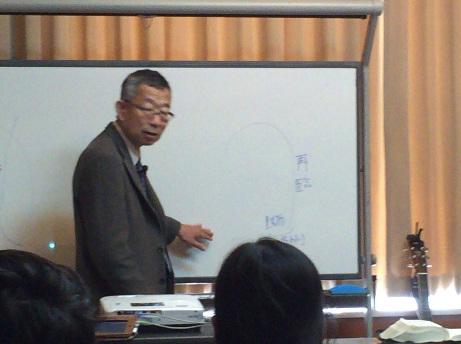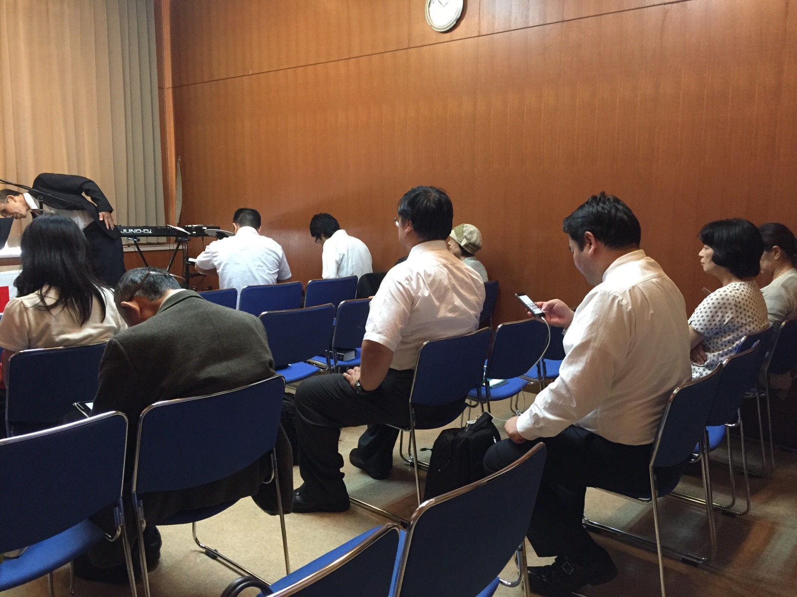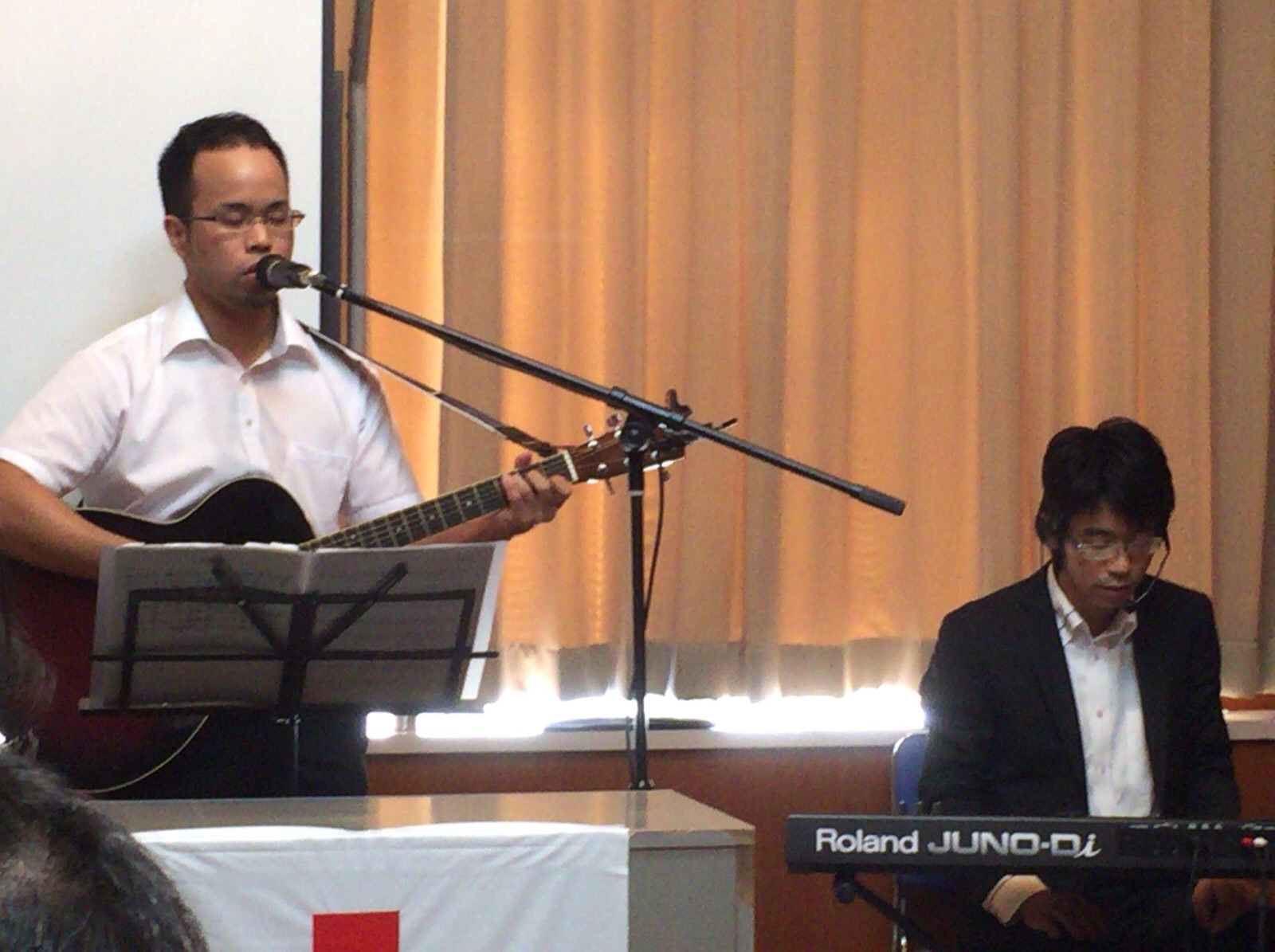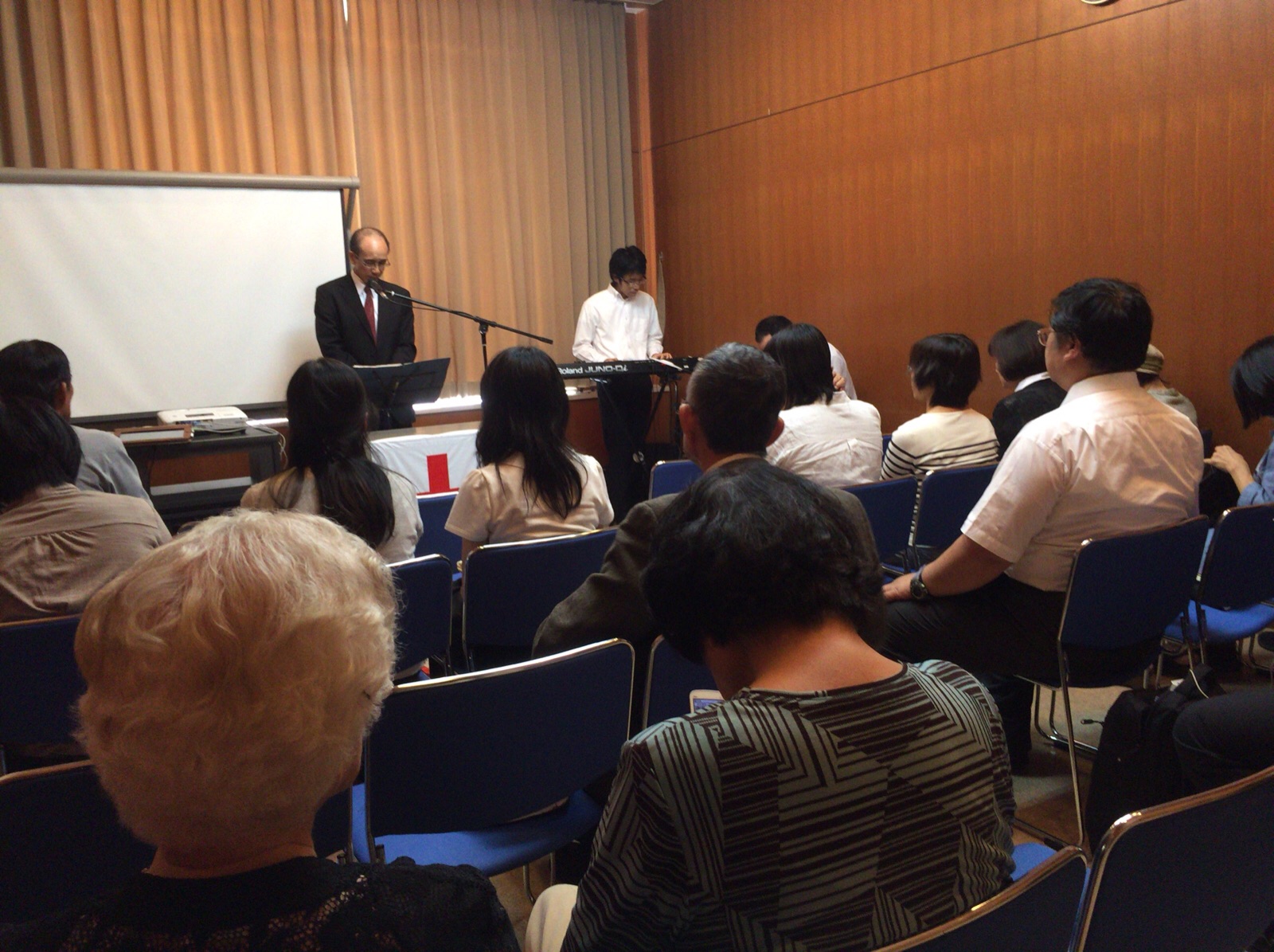 涼君はプロジェクターの準備に続いて、ドラム、ギターの音出し。 永藤さんが「iPadから歌詞を出す方法を教えて〜」と言っています。 沖縄エルサレム ♪