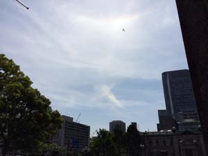 黒い衣装で、めちゃくちゃ暑かったのですが、ふと見上げると空には、セスナ機とひこうき雲が彩雲になり、虹色の光輪も出て励ましてくれました。