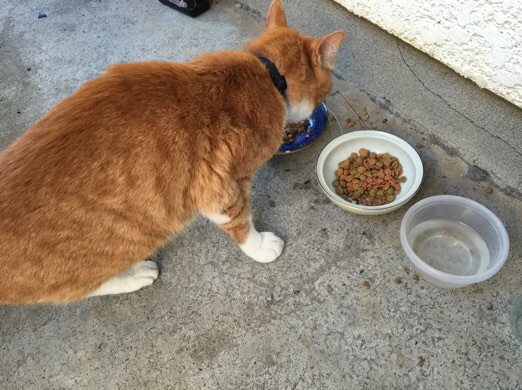 昨日は、朝から雨風の天気だったためか、ごはん食べに来なかったヨレヨレじいちゃん。今朝は、いつもの時間にやって来て、外から「ごはんくれ〜!」と鳴くので、猫缶とフードをあげると、ガツガツ食べています。