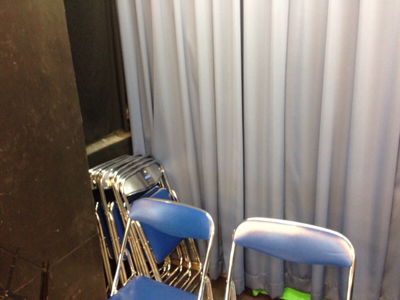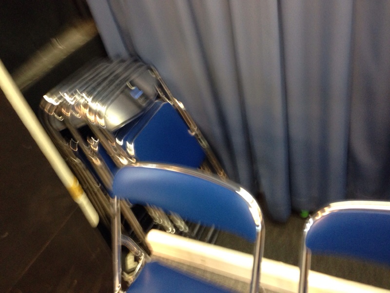会堂では月曜第一礼拝が始まります。舞台の端に椅子が沢山置いてあるのを発見。オーケストラ用に設営の方々が置いて下さったみたいです。