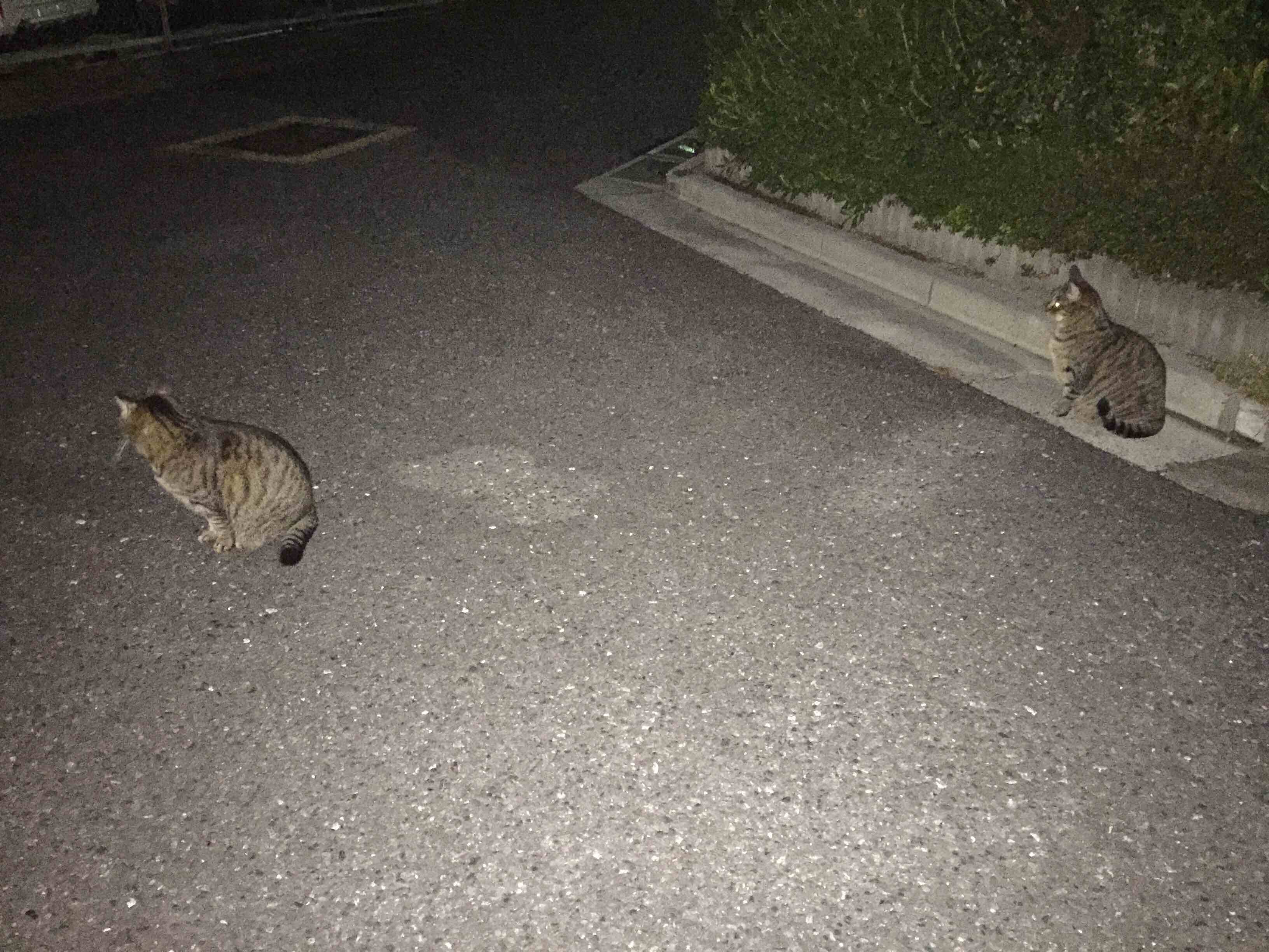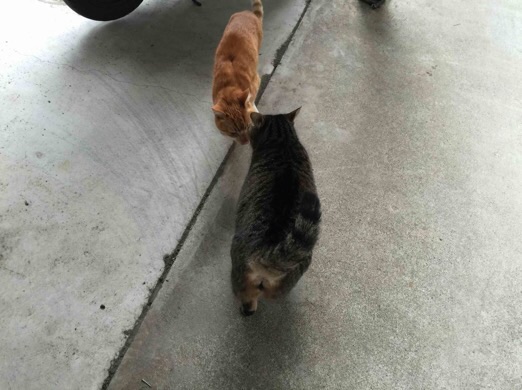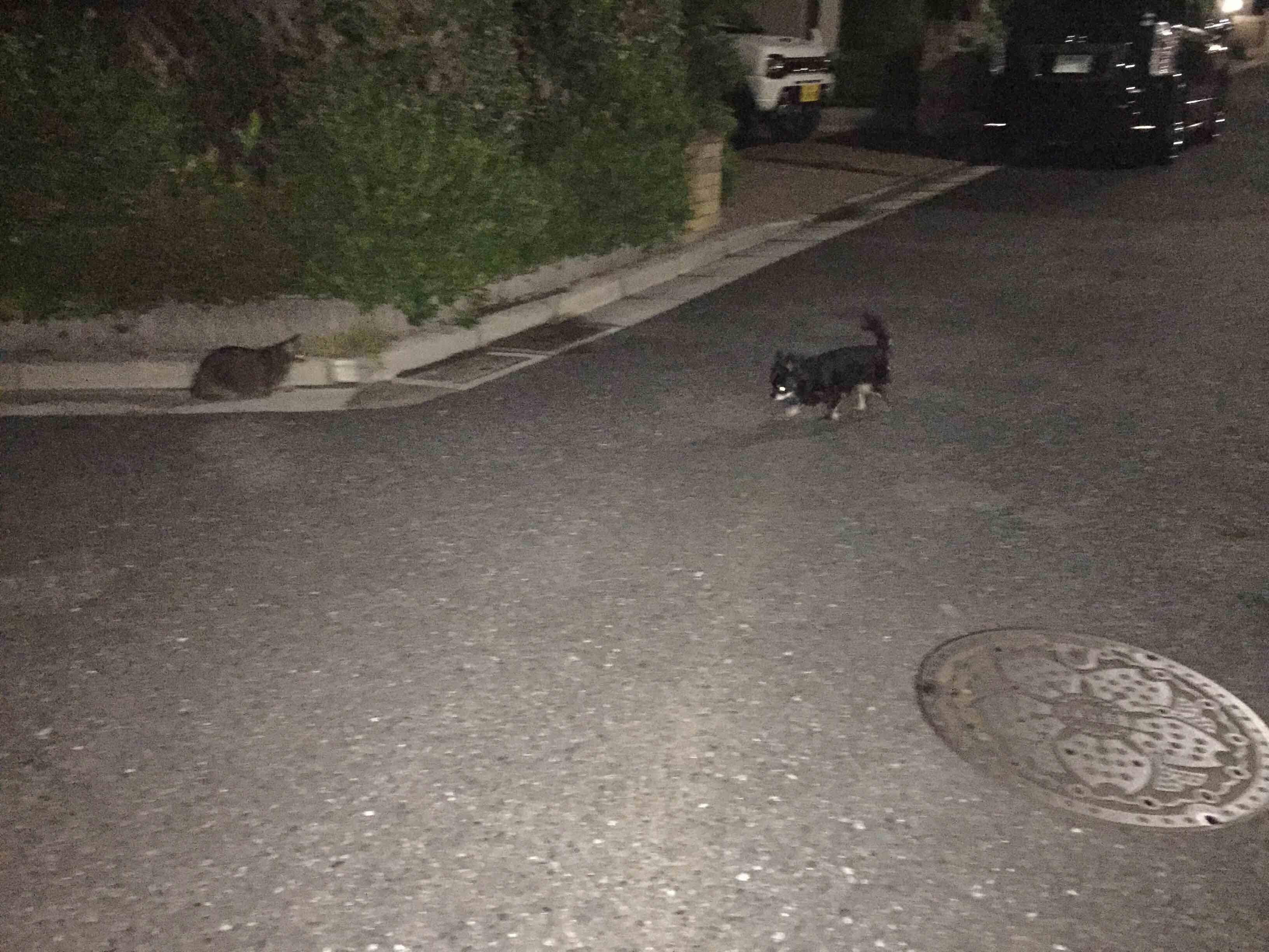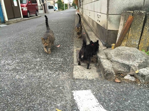 毎日恒例の朝のお散歩。 辻郷家のワンニャンは、毎日、朝晩お散歩します。 毎日、うちにご飯を食べに来るよそのニャンコとはち合わせ。散歩から帰ると、2度目の朝ごはん。